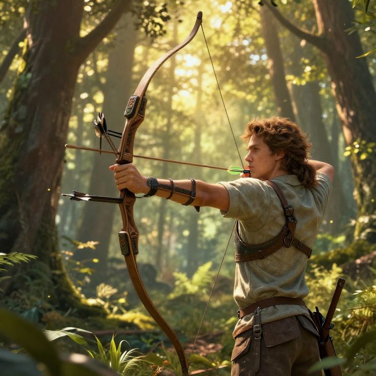Archery image featuring a skilled archer aiming a bow in a lush forest, arrows ready to fly, with golden sunlight filtering through the trees, detailed textures on wood and feathers, dynamic and immersive fantasy illustration style.