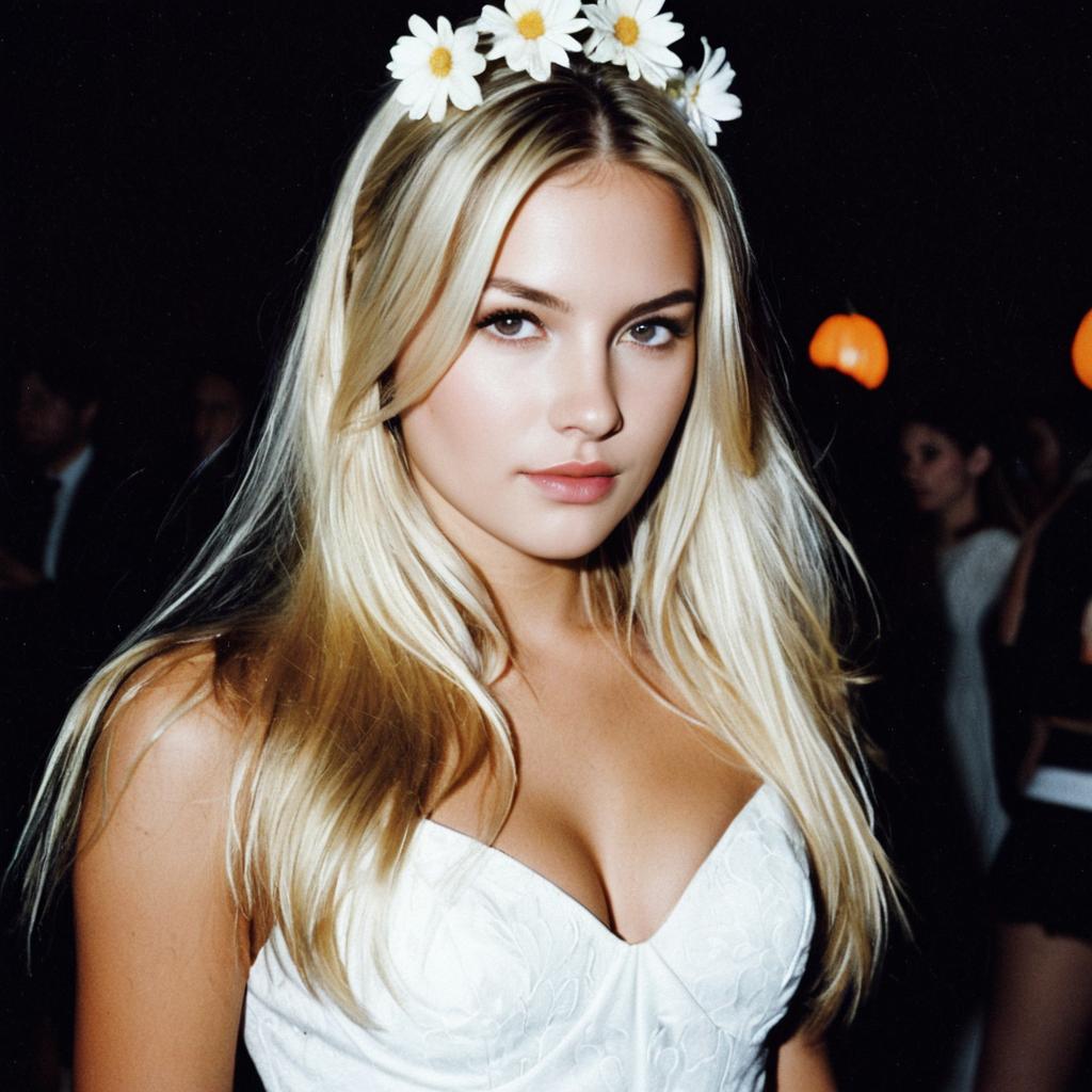 Costume world,1girl, solo, dress, multicolored clothes, multicolored dress, blonde hair, long hair, standing, looking at viewer, flower, hair ornament, bare shoulders