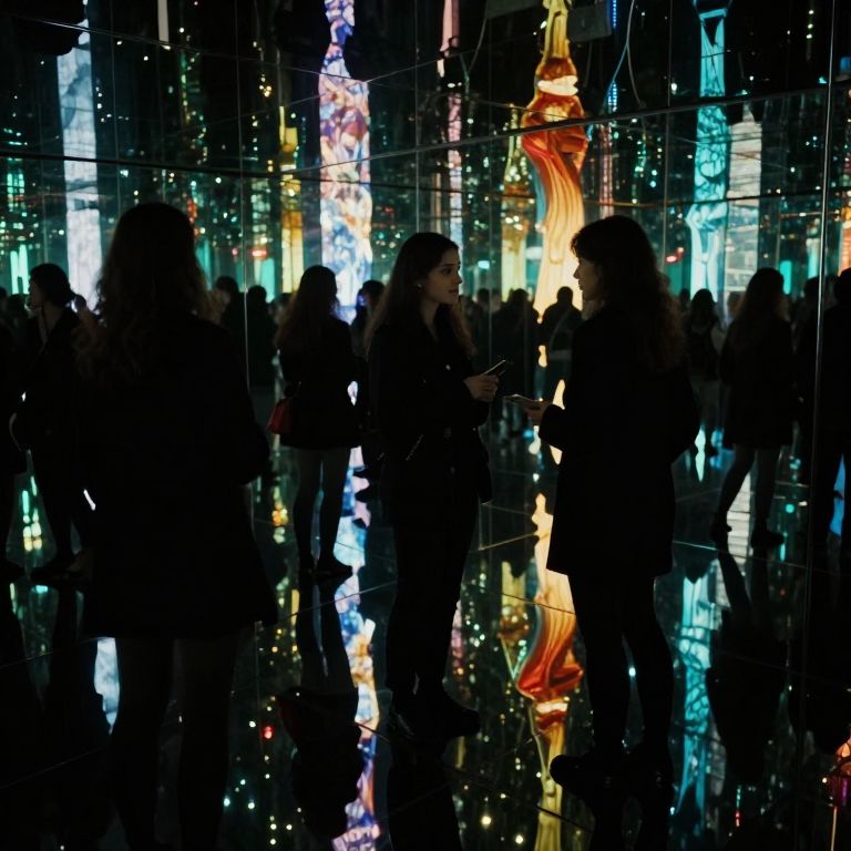 In a labyrinth of whispering mirrors, shadowless people converse with their reflections, who live vibrant lives only visible when the originals are still.
