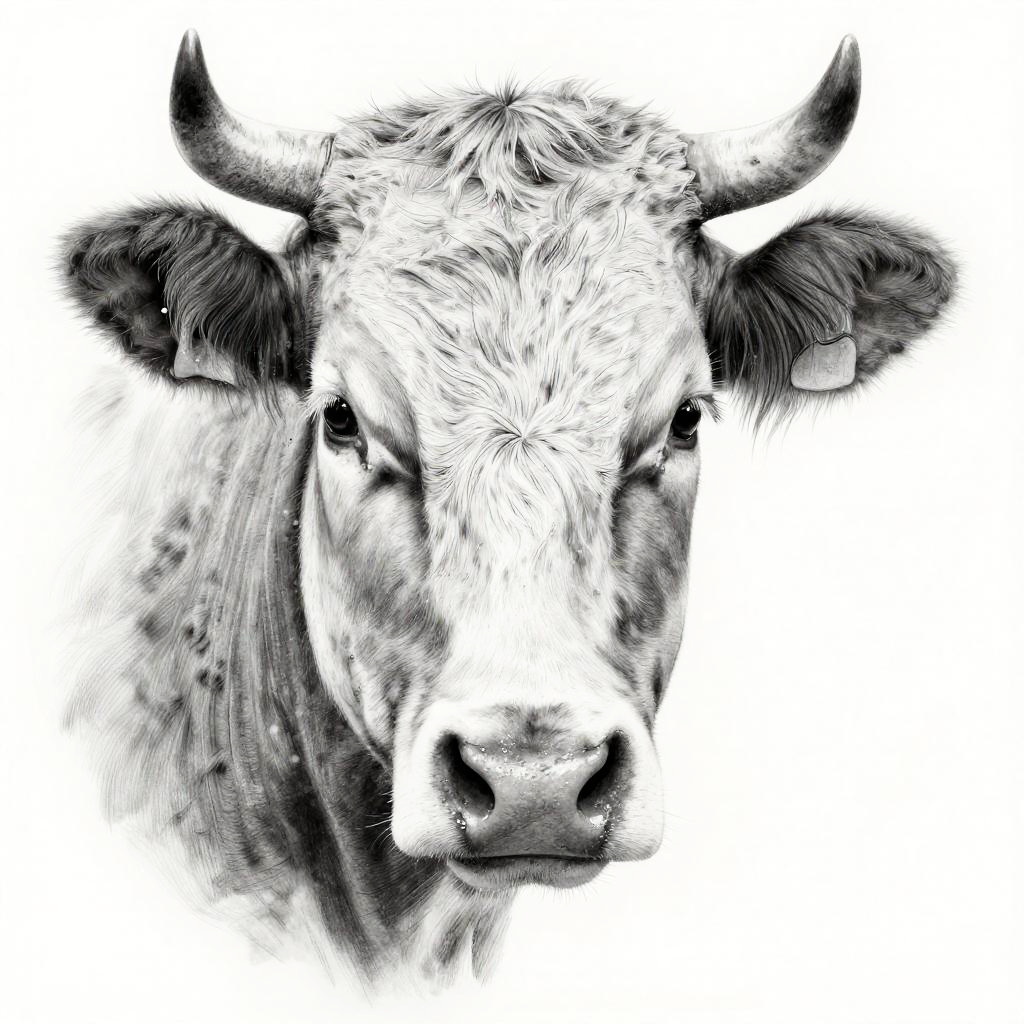 Realistic cow face drawing showing textured fur and lifelike features, gentle expression with detailed eyes and wet nose, soft shadows and subtle highlights, monochrome pencil sketch style with fine line work and smooth gradients.