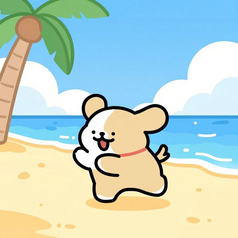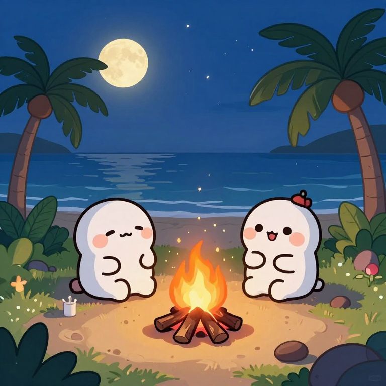 Digital illustration of two cute, white, cartoon ghost characters with blushing cheeks, sitting by a campfire on a sandy beach at night. The ghosts have black, smiling eyes and are positioned on either side of the fire. One ghost has a red ant on its head. The background features a dark blue night sky with a full moon, calm ocean, and two palm trees on either side. The scene is adorned with grass, small rocks, and flowers surrounding the campfire. The fire emits a warm, orange glow, contrasting with the cool blue hues of the night.