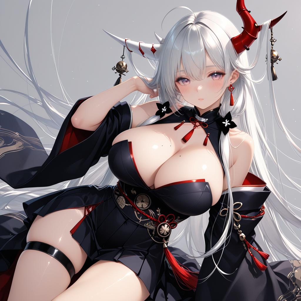 Hakuryuu (azur lane), azur lane, 1girl, asymmetrical horns, mismatched horns, red horns, white horns, hair on horn, multiple horns, hair between eyes, grey eyes, white hair, long hair, grey hair, very long hair, large breasts, huge breasts, mole on breast, cleavage, thigh strap, skindentation, earrings, by artist shokuyou mogura, dark_illustrious