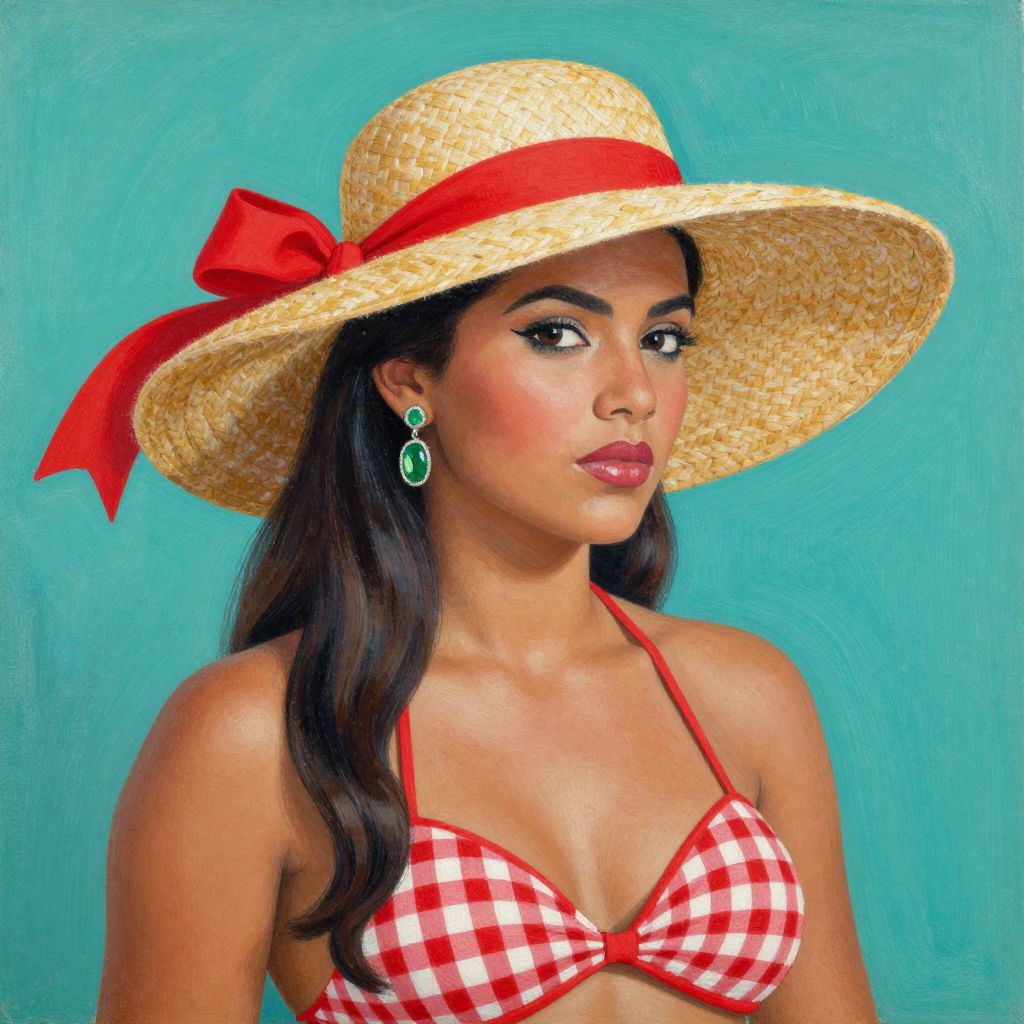 Cuban Girl depicted in vibrant detail by Jose Manuel Abraham, showcasing a woman wearing a wide-brimmed straw hat tied with a red ribbon, complemented by a red-and-white checkered bikini top, her long dark hair cascading over her shoulders, and adorned with a green gemstone earring against a teal background.