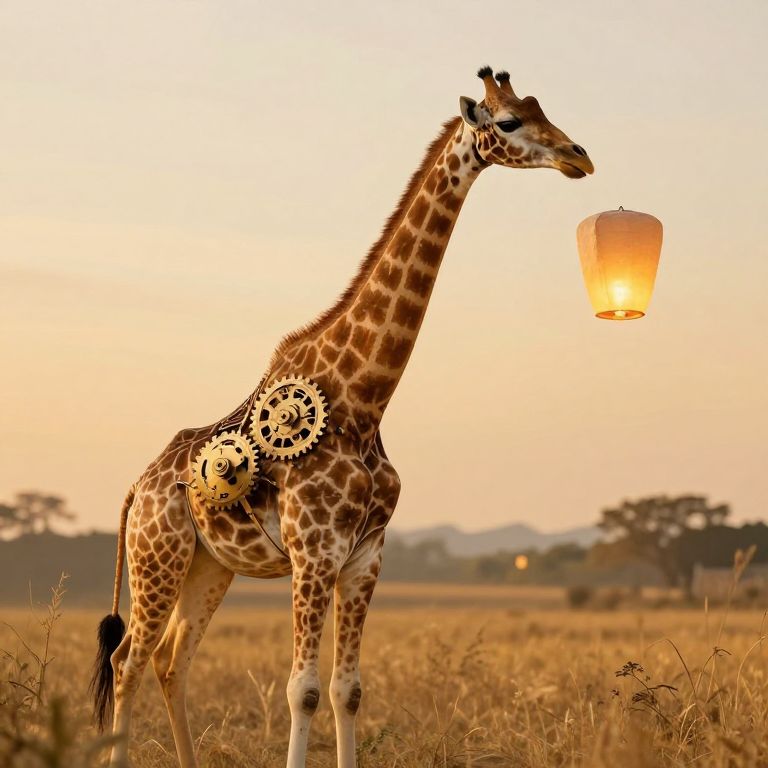 Giraffe adorned with mechanical gears and dangling golden ornaments stands tall in a desert landscape, its elongated neck reaching toward a twilight sky dotted with stars and soft clouds.