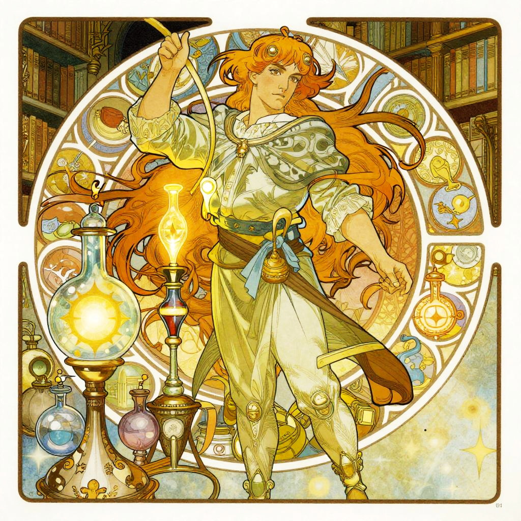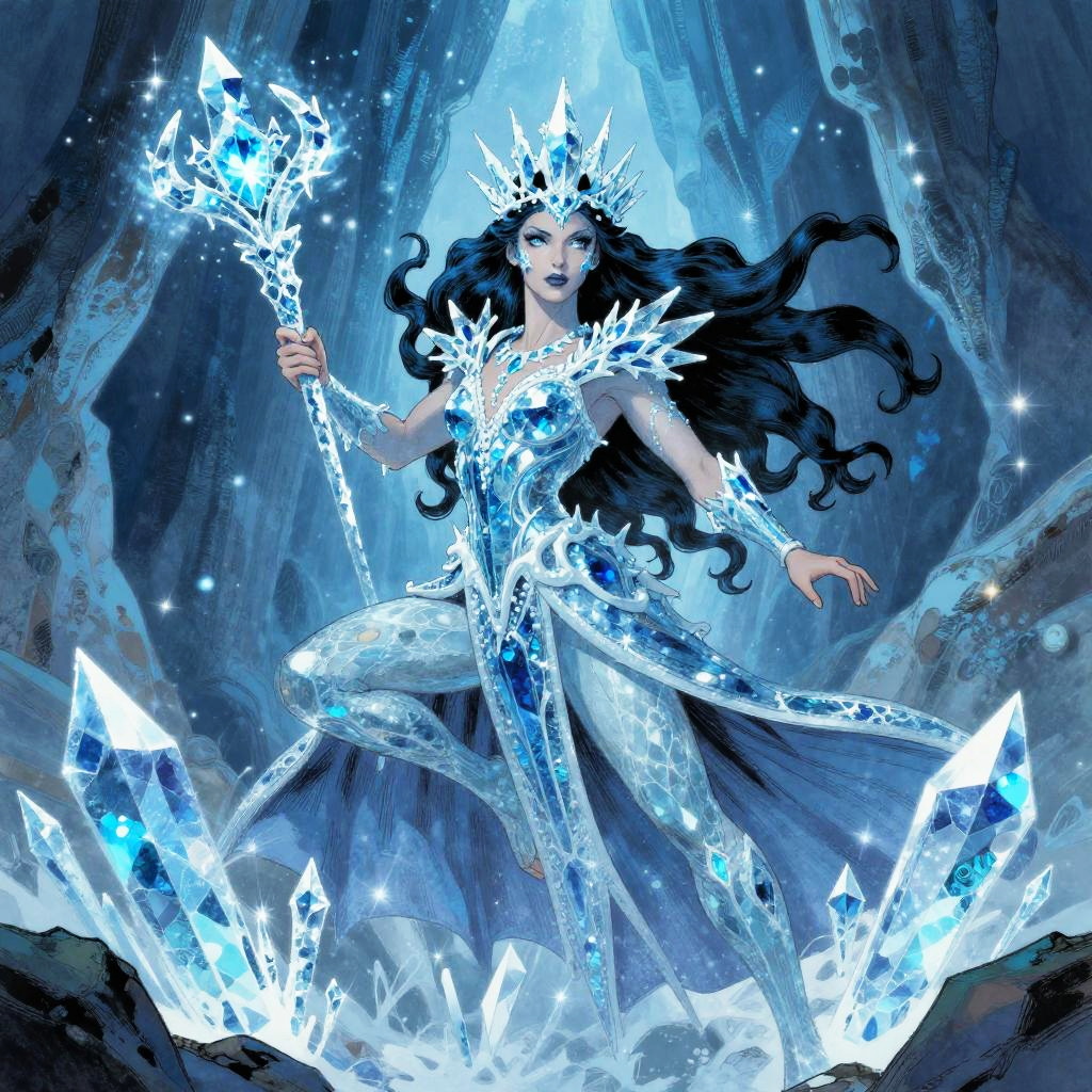 A depiction of a mystical ice sorceress, equipped with crystal staff and frostbitten crown, in a glacial cavern sparkling with magic, inspired by Greg Tocchini, Brian Froud, detailed linework, bold color palette, dynamic pose