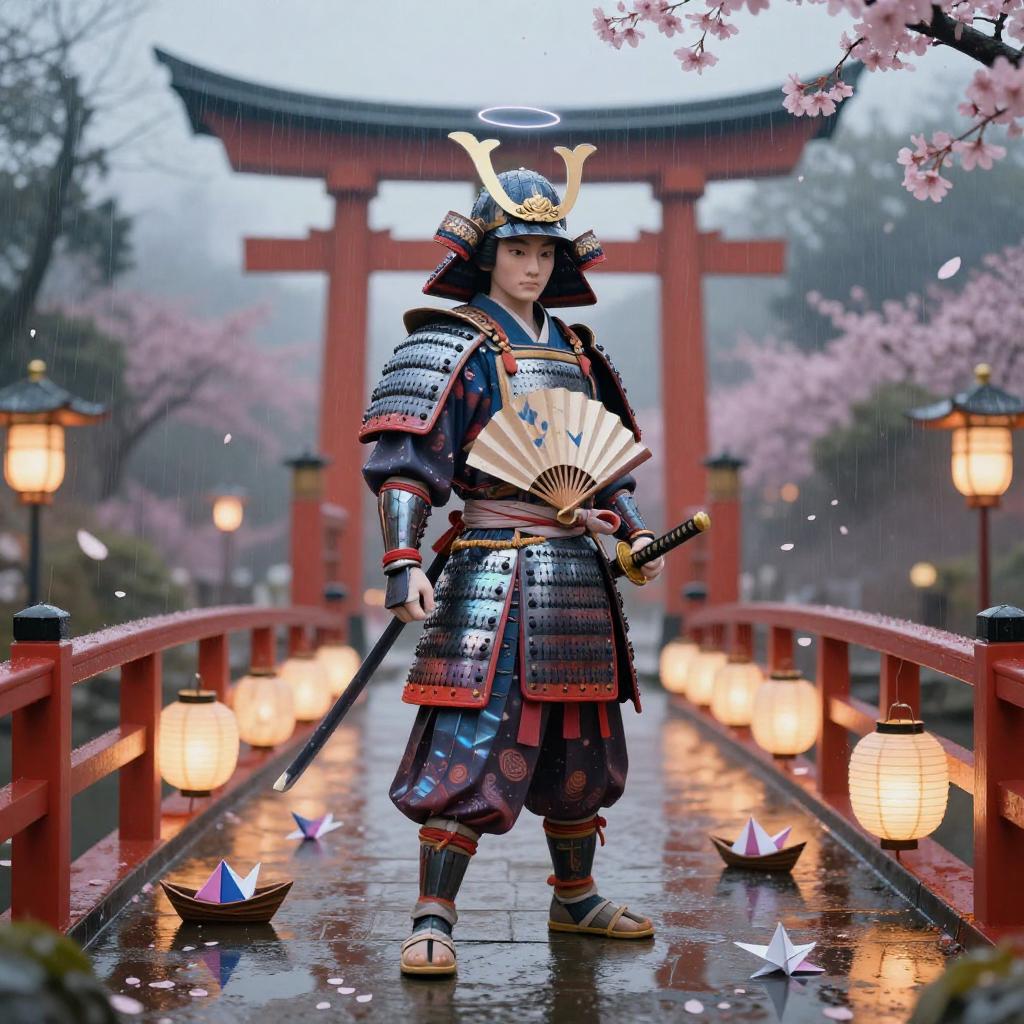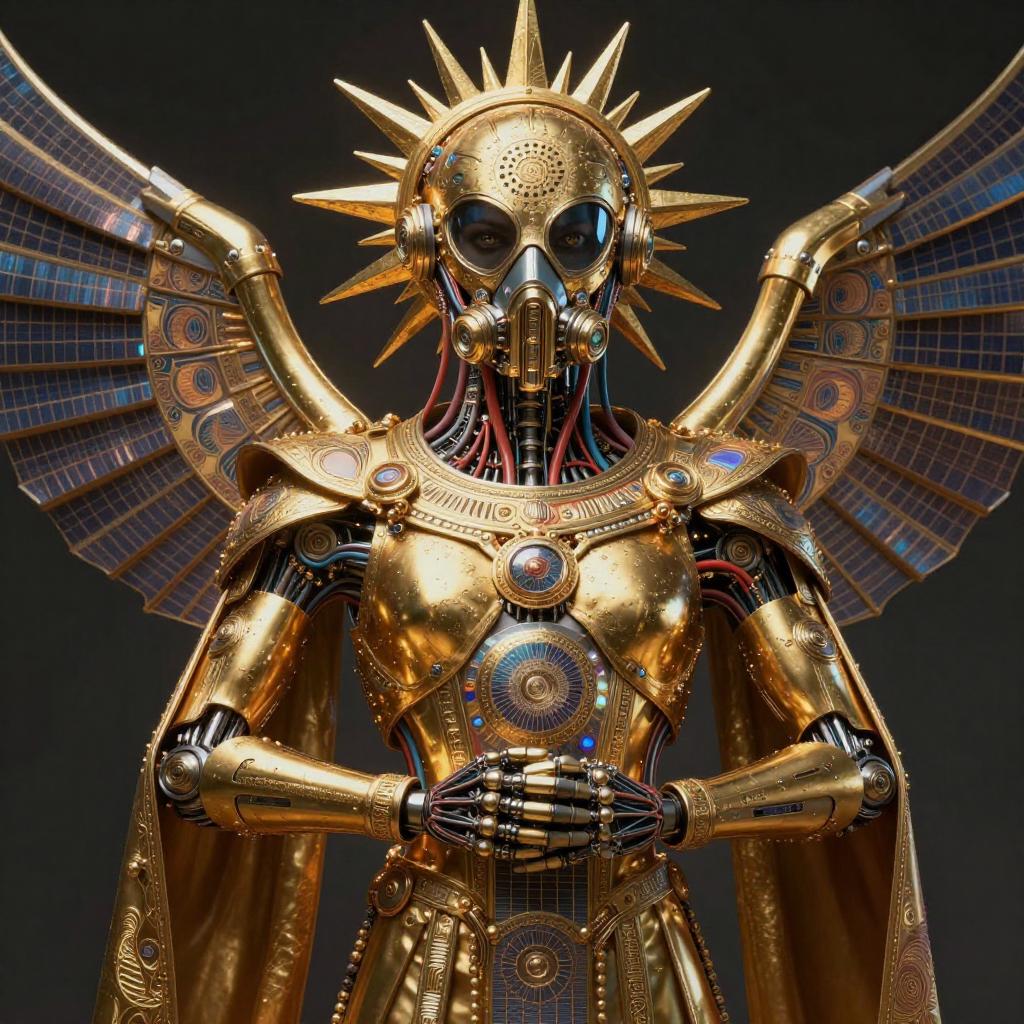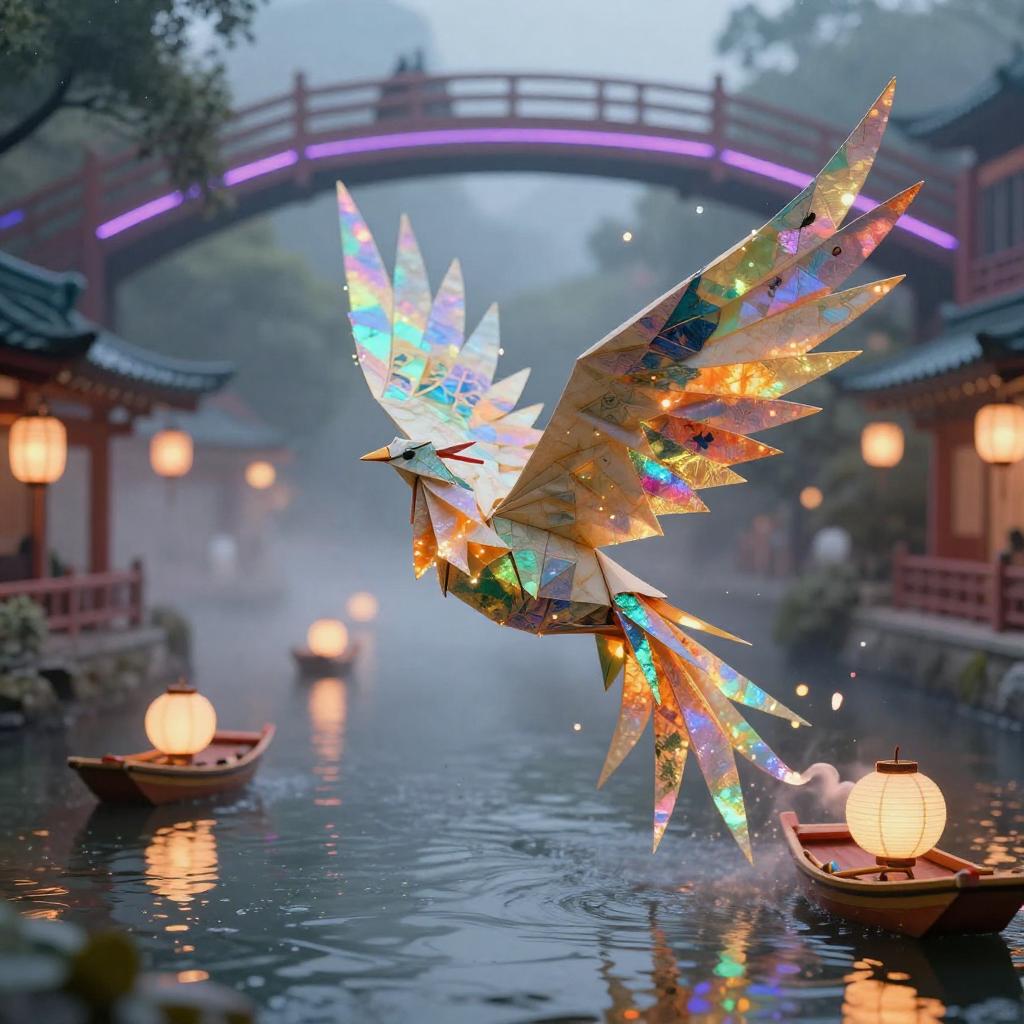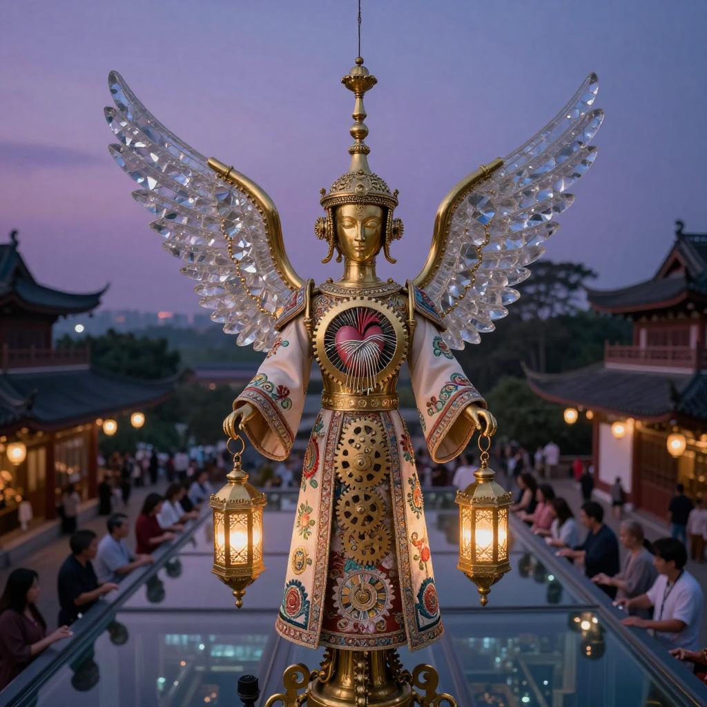 Clockwork nightingale diplomat — lacquered brass body, crystalline wings, filament-core heart and embroidered gear-robe perched in temple spire of hanging lanterns suspended over a glass-canyon of reflected prayers beneath a violet dusk sky. Shot on Hasselblad X2D 100MP with 120mm XCD lens, hyperdetailed, 8K HDR, dramatic lighting, cinematic atmosphere.