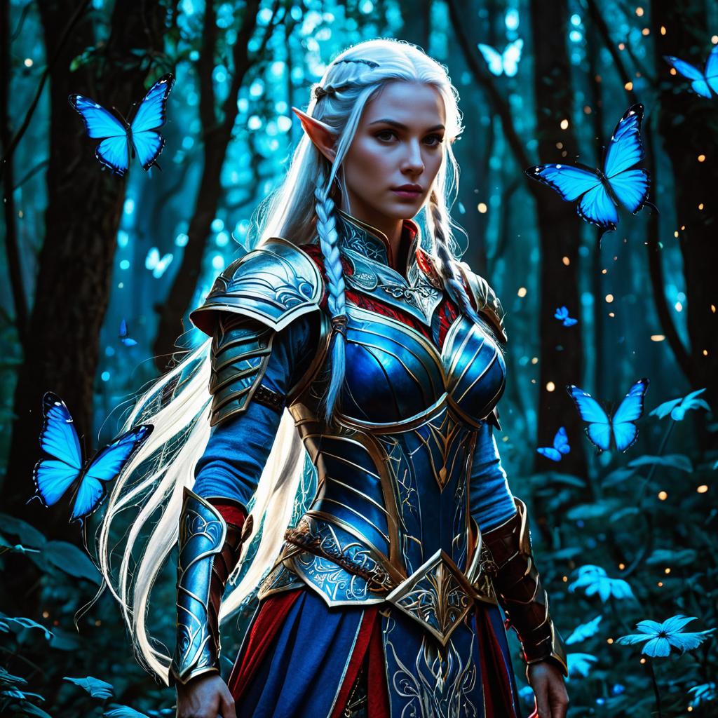 A confident female warrior with silver braided hair standing in a dense magical forest during twilight, wearing ornate gold and blue armor, holding a glowing blue magical orb in her hands, surrounded by glowing blue butterflies, tall red trees and faint golden light rays piercing through foliage, highly detailed, fantasy art style, vibrant lighting and strong color contrast