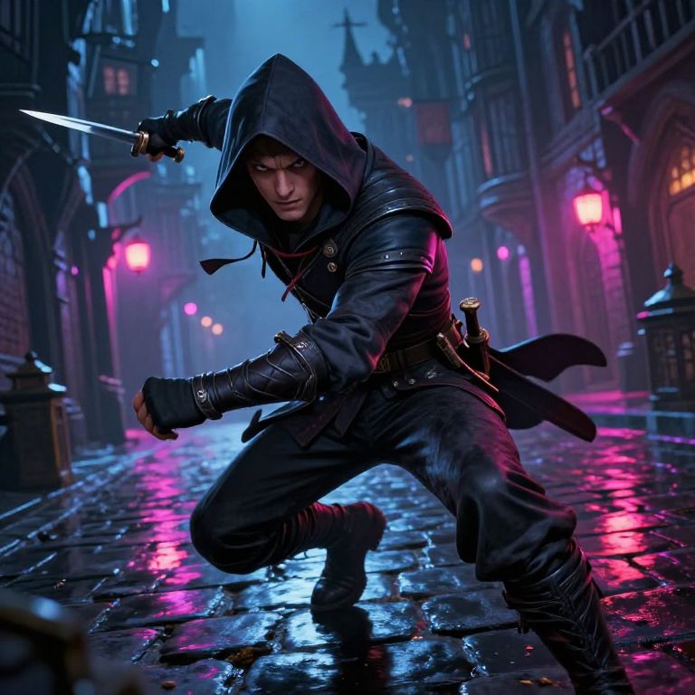 A digital illustration of a stealthy, hooded assassin crouching in a neon-lit, cobblestone alley at night. The assassin, with a focused expression, wields a glowing sword in his right hand and has his left hand extended forward. He wears black leather armor, fingerless gloves, and boots, with a sheathed knife on his left hip. The alley is illuminated by vibrant pink and blue neon lights, reflecting on the wet cobblestones. Gothic-style buildings with ornate details line the background, adding a mysterious, urban fantasy atmosphere.