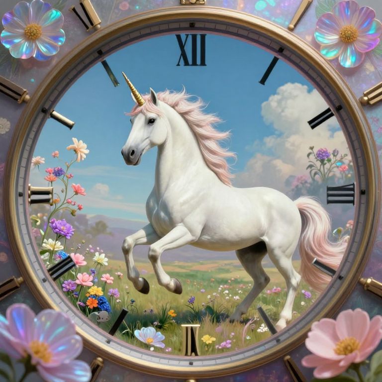 A dreamlike landscape infused with surreal elements, this image portrays a majestic unicorn gracefully descending from an enigmatic timepiece in the sky. The perspective is distorted as if viewed through an impossible mirror, enhancing and altering the vivid hues of deep blues, purples, and pinks to create an emotional gradient that evokes wonder and enchantment while hinting at the mysterious nature of the dream world.