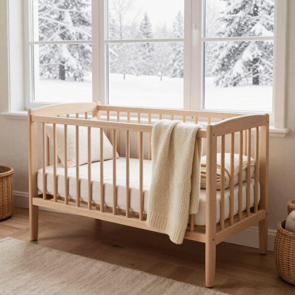 Scandinavian-inspired babybett with clean lines, light wood finish, and cozy knitted blankets, positioned by a large window overlooking a snowy landscape, emphasizing warmth, simplicity, and comfort in a winter nursery scene.