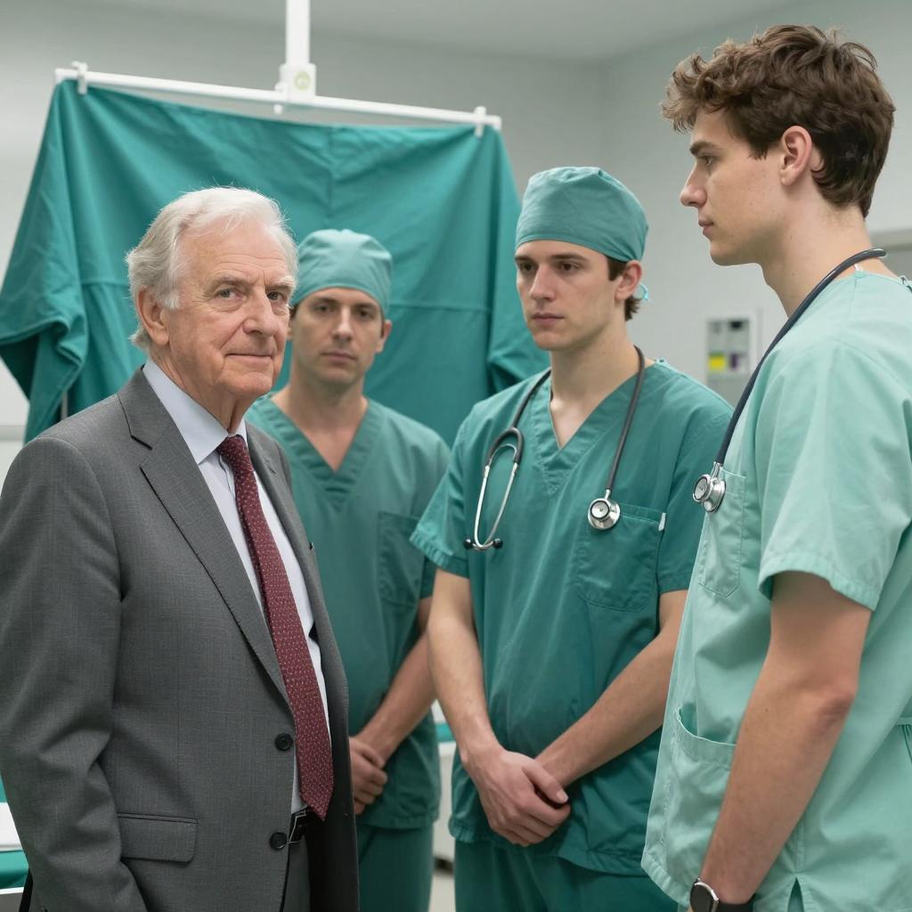 Photograph of a hospital scene. Four men in a sterile room: elderly man in gray suit with red tie, middle-aged man in green surgical scrubs, young man with green surgical cap, and young man in light green scrubs. Elderly man facing camera with slight smile, others look at him. Green surgical drapes in background. Elderly man's hair gray, others have brown hair. Surgical scrubs have stethoscope. Tiles on wall.