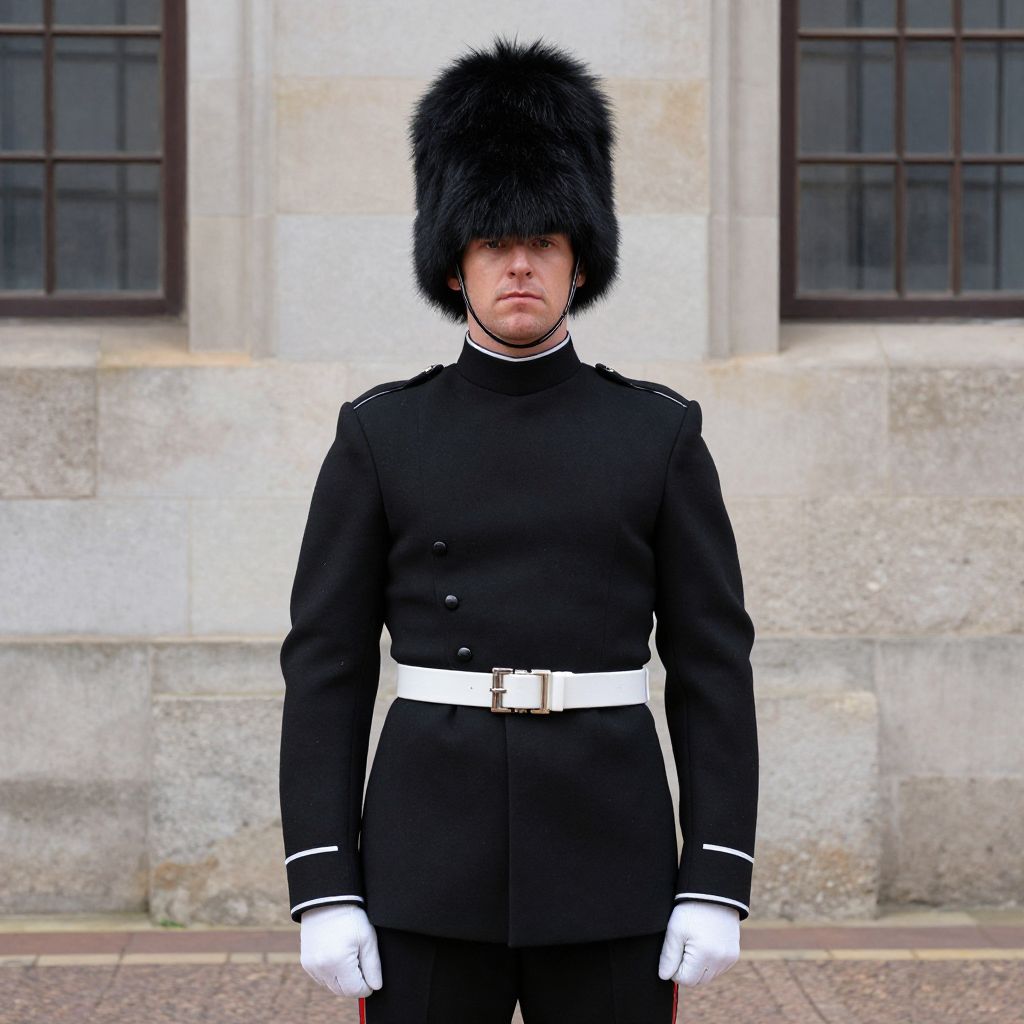Queens Guard Fancy Dress, man in uniform standing in front of a building