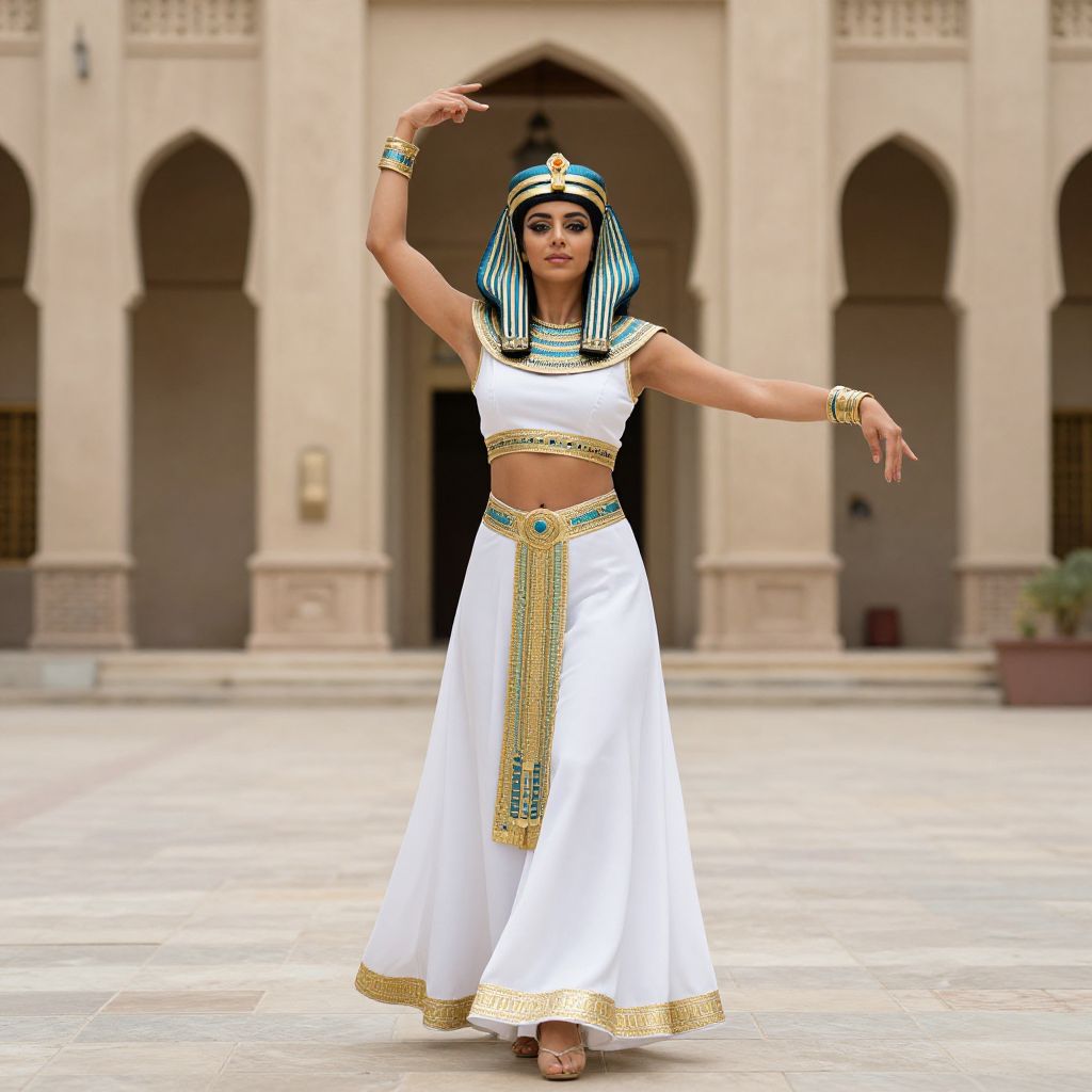 Egyptian dance clothes, a woman in egyptian costume standing in front of a building
