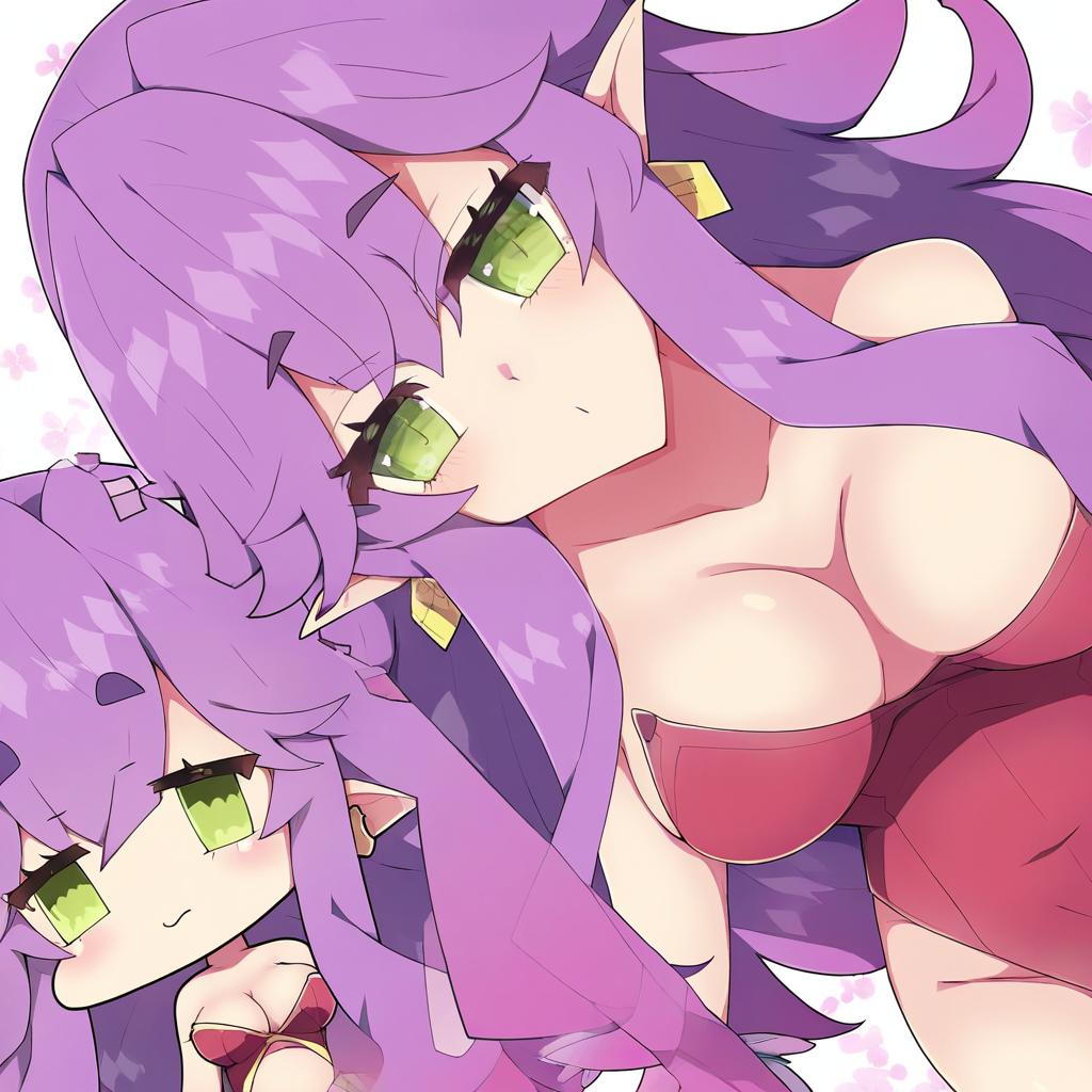 Angela (seiken densetsu 3), seiken densetsu, 1girl, pointy ears, green eyes, purple hair, long hair, very long hair, large breasts, medium breasts, cleavage, red leotard, red leotard, bare shoulders, earrings, by artist milkpanda, leet
