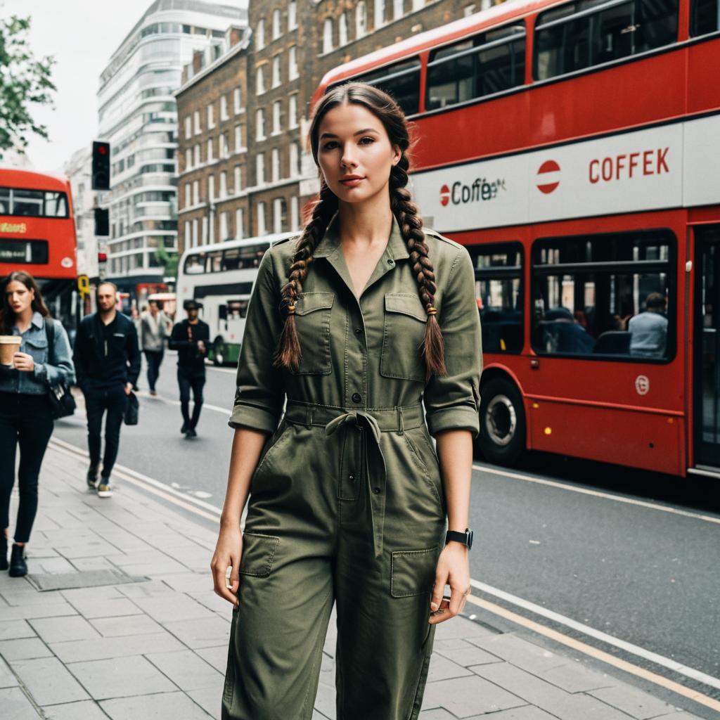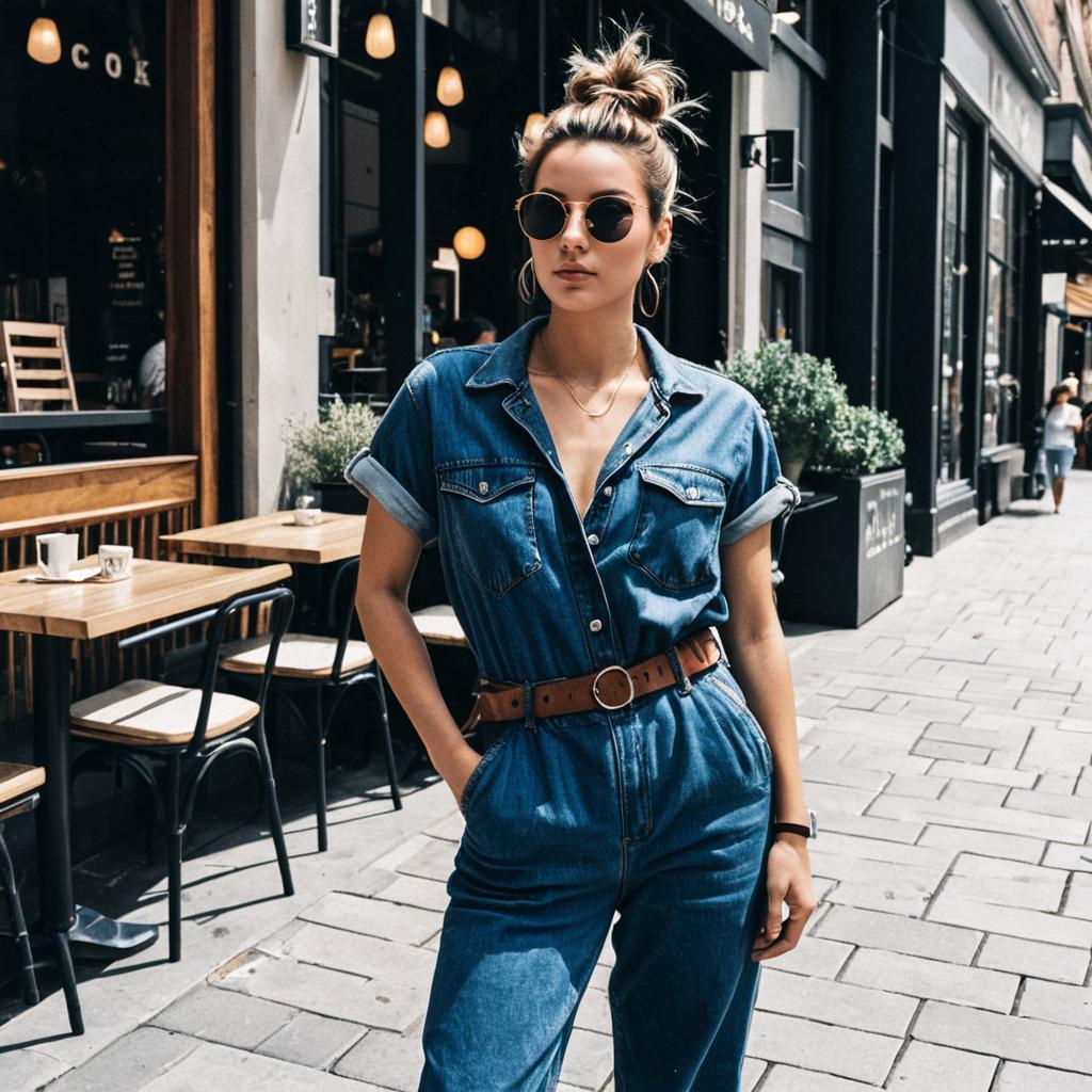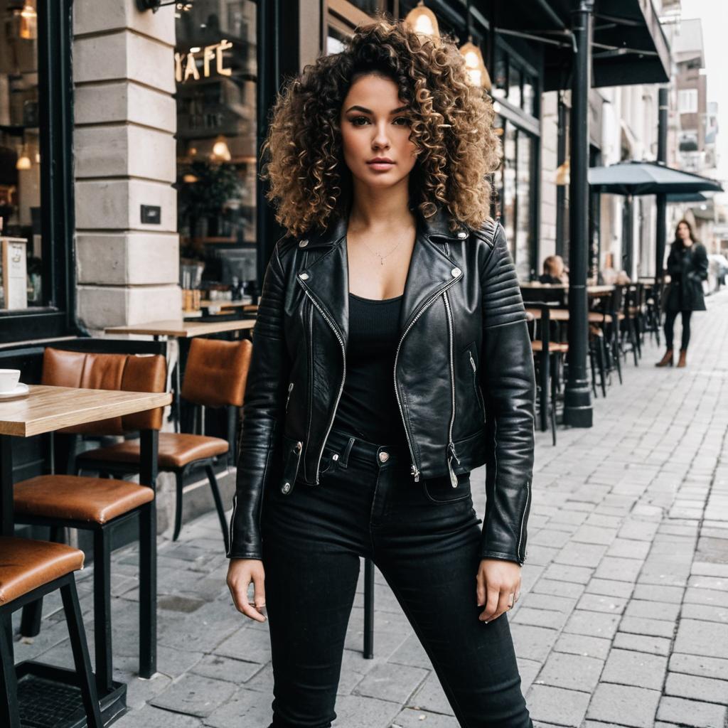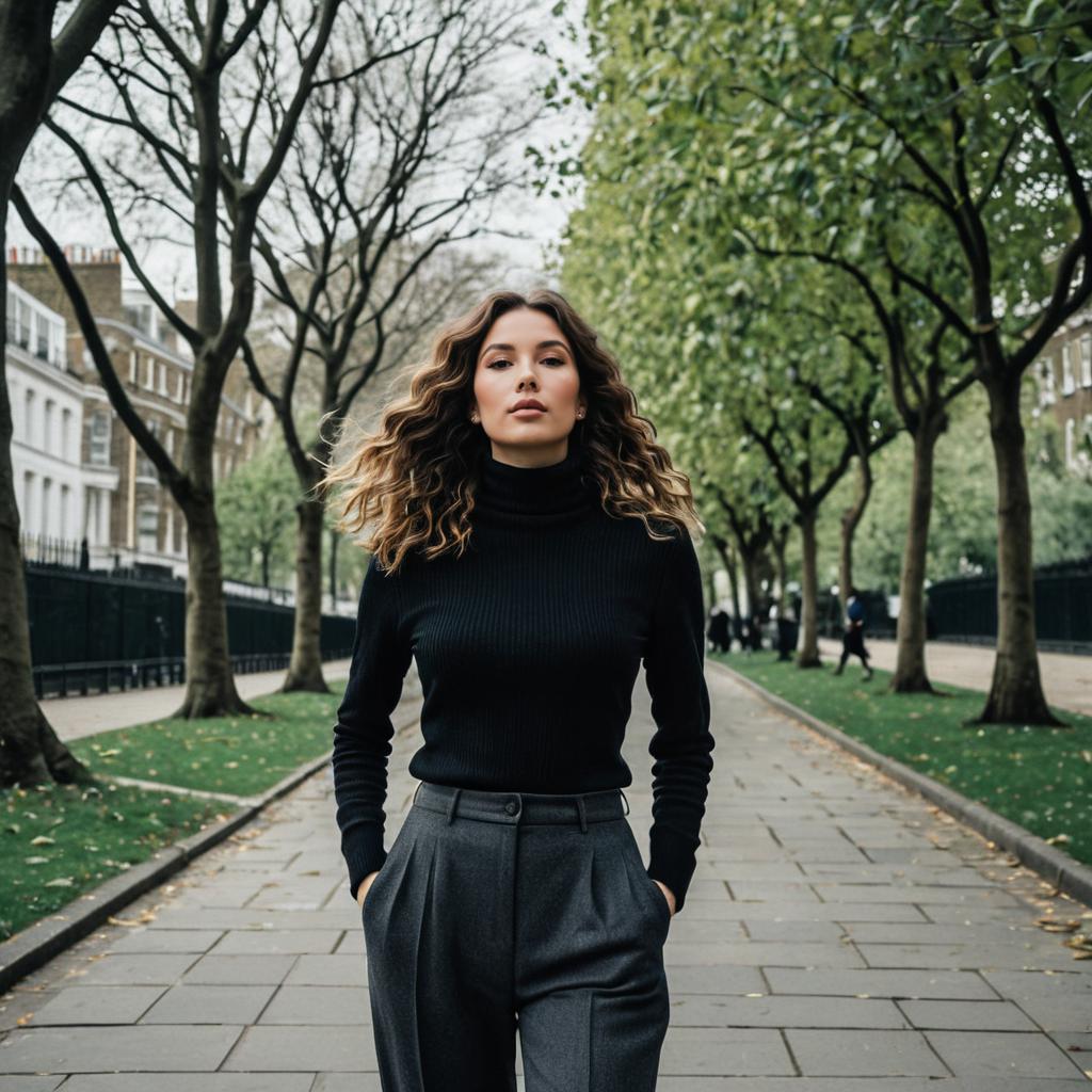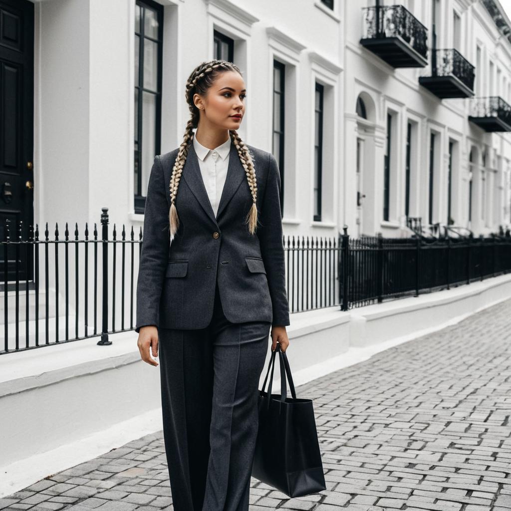 Street style photograph of a woman with wind-blown wavy hair, looking towards the sky. She is wearing a tailored blazer and wide-leg trousers set in charcoal grey. She stands on a paved sidewalk in front of stylish cafe exterior with outdoor seating. Daylight, photorealistic, 8k, urban chic.
