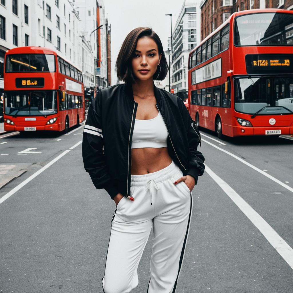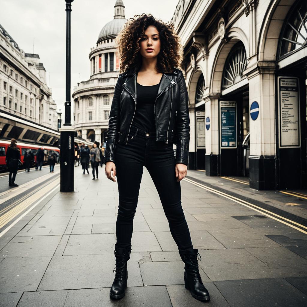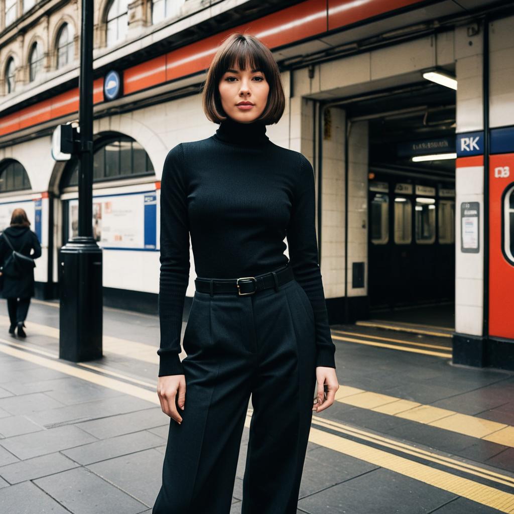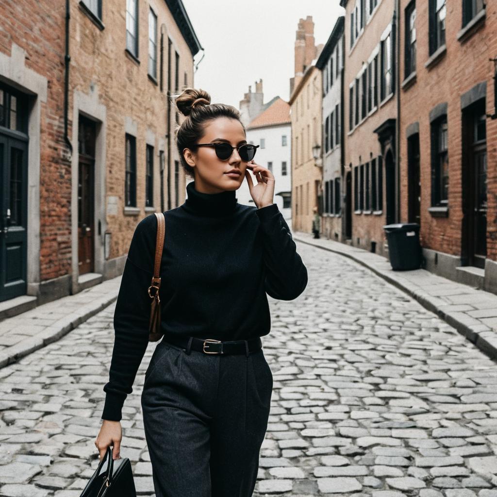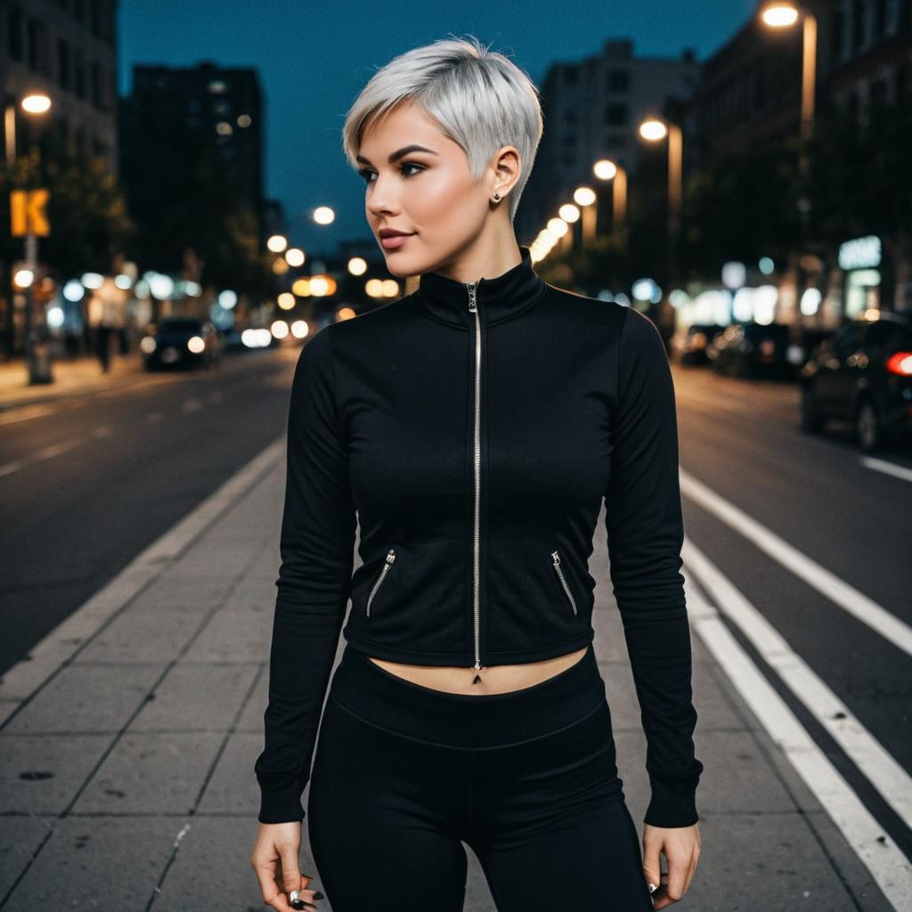 Street style photograph of a woman with wind-blown wavy hair, looking towards the sky. She is wearing a tailored blazer and wide-leg trousers set in charcoal grey. She stands on a paved sidewalk in front of stylish cafe exterior with outdoor seating. Daylight, photorealistic, 8k, urban chic.