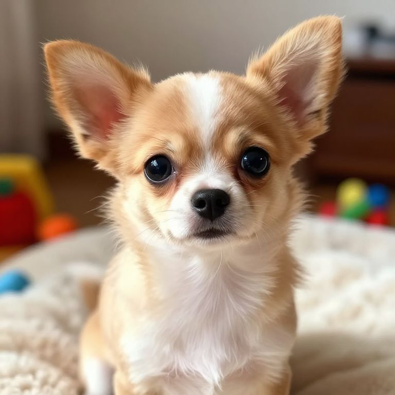 Canina close-up of a curious puppy with sparkling eyes and fluffy ears, sitting in a cozy indoor setting, warm natural lighting highlighting the softness of its fur, with a background of playful toys and a comfy blanket, highly detailed digital painting.