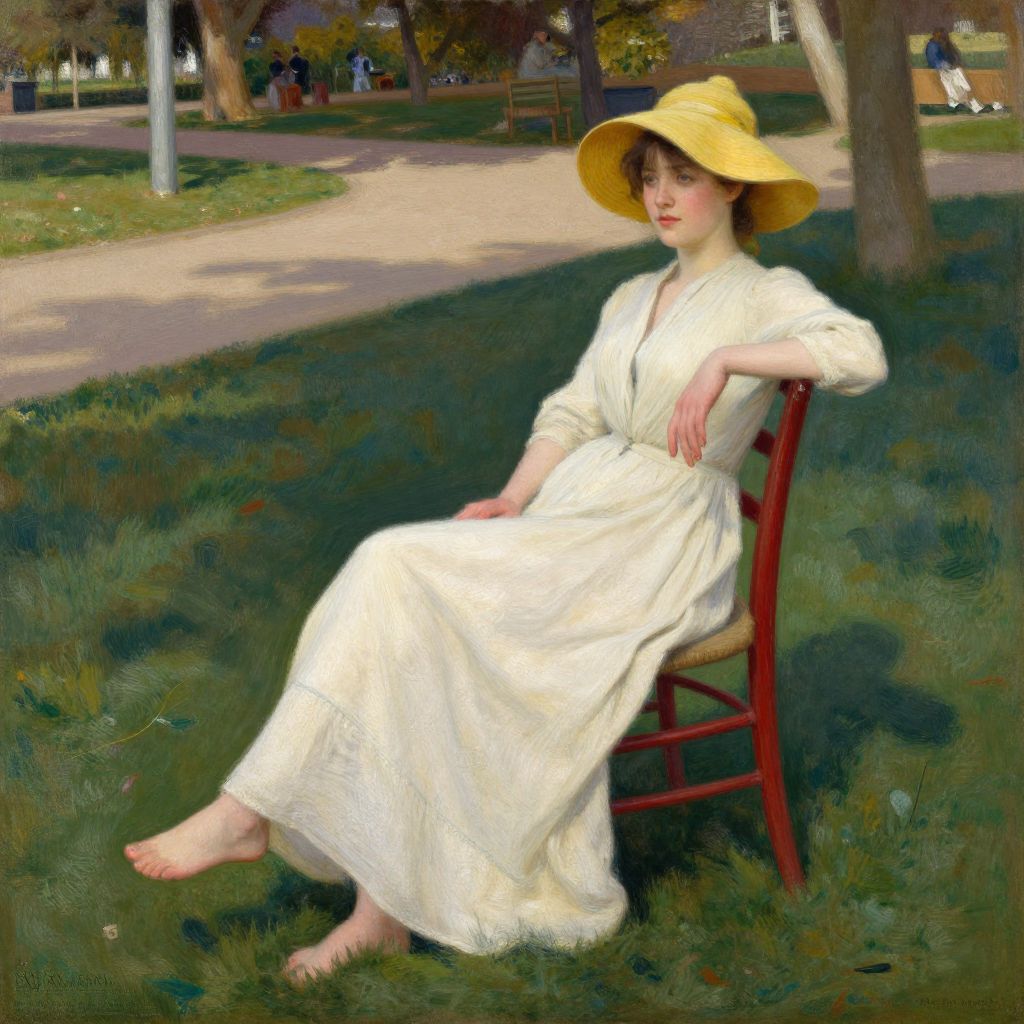 Woman seated gracefully on a red wooden chair in a serene park setting, wearing a flowing cream gown and a wide-brimmed yellow hat, with her bare feet resting on the grass and a shadow cast beneath her, evoking a tranquil moment captured by William Merritt Chase in his 1894 artwork *Horas Ociosas*.