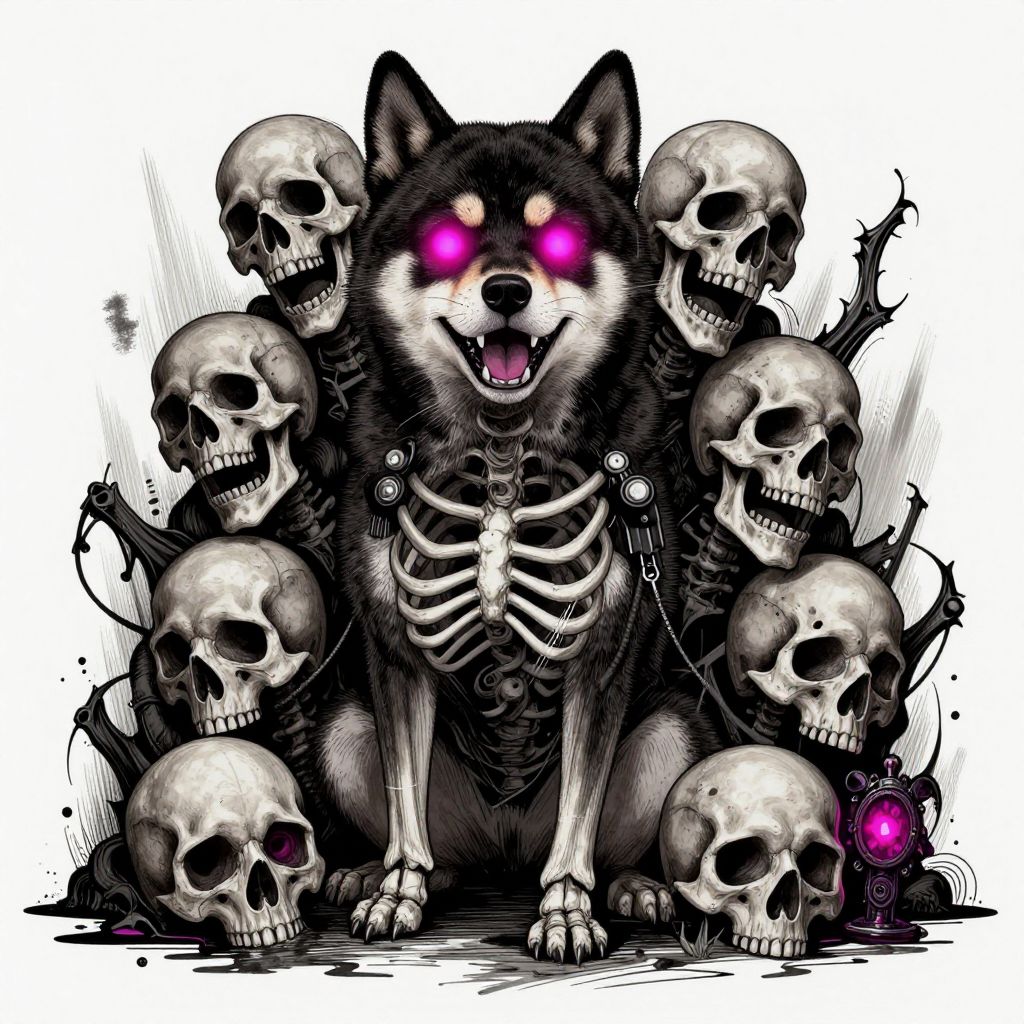 Create an image in inkpunk style, An undead skeletal Shiba made of human faces in anguish and skulls overalldetail> artistic aesthetics, excellent composition masterpiece, 1glowing an ominous magenta color, Niji Stan Katayama style