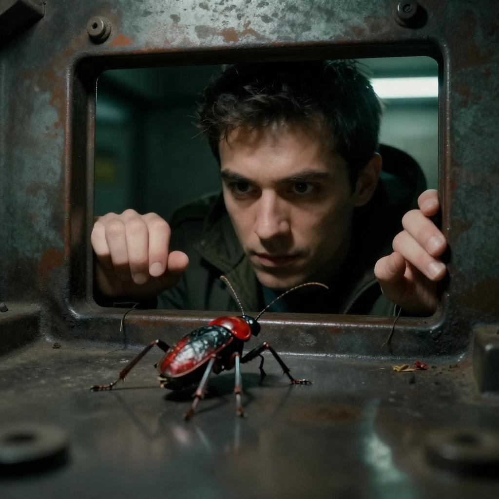 Man with short dark hair, wearing a green jacket, peeks through a metal slot, eyes intently on a red and black insect-like creature on a reflective surface. Dim, green and red lighting. Man's hands grip the metal slot. Insect has elongated legs and tattered ends. Underground or industrial setting.