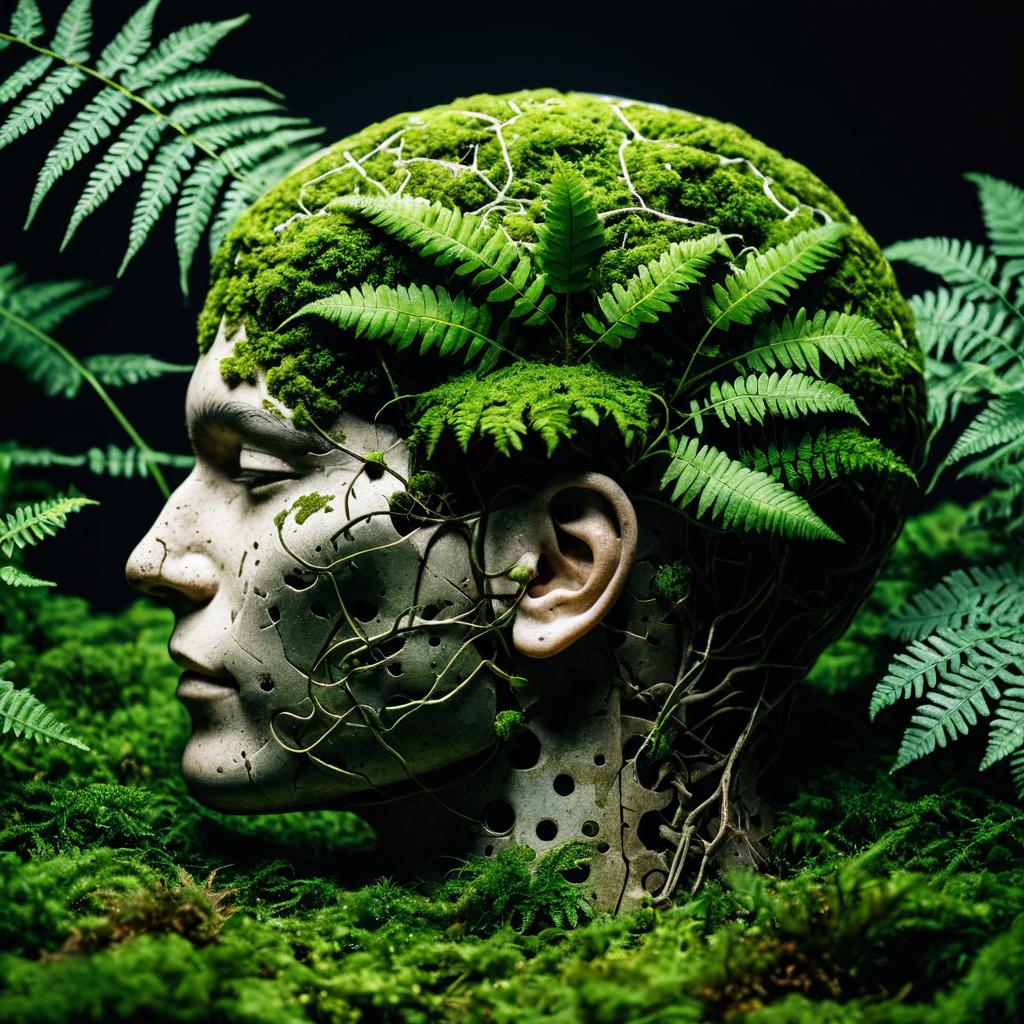 Eco-Friendly AI Brain Sculpture with Moss and Ferns