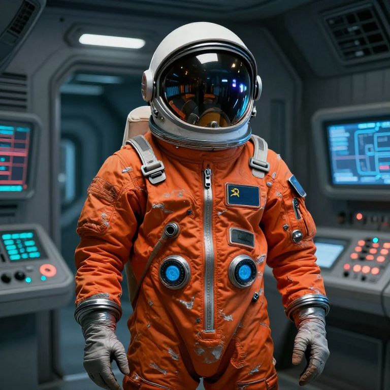 Orange Soviet space suit in a futuristic space station interior, glowing control panels reflecting off the helmet, worn and weathered fabric, nostalgic Soviet design mixed with cyberpunk elements
