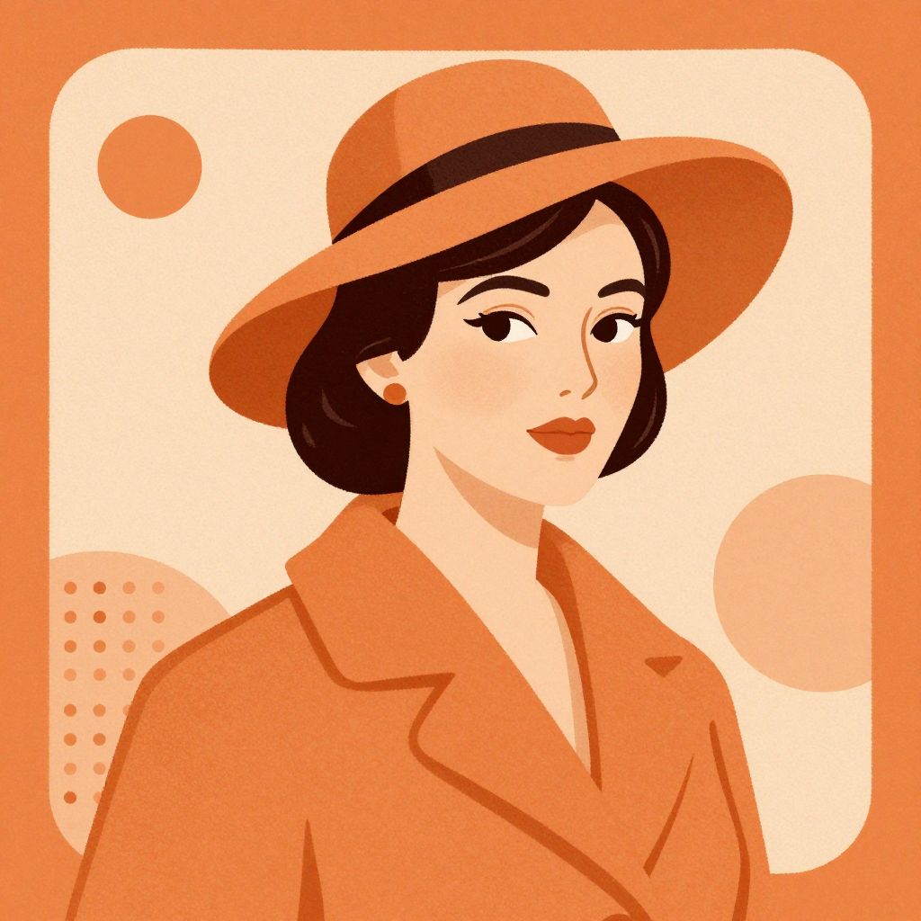 A vintage-style illustration of a woman in a hat and coat, with a warm orange tint and mid-century modern graphics.