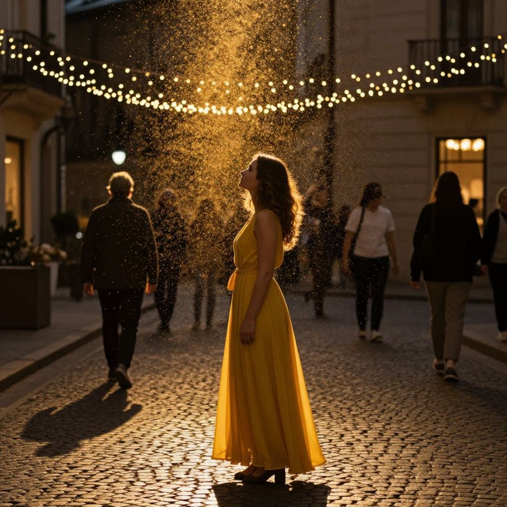 Golden particles cascade like shimmering confetti above a cobblestone street, illuminating a woman in a flowing yellow dress as she stands amidst the warm glow of string lights and the soft silhouettes of passersby.