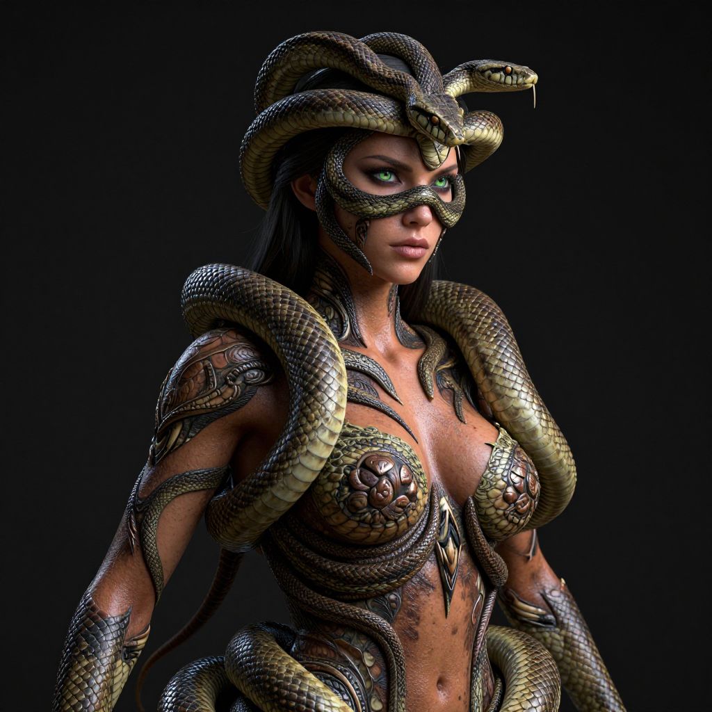 CGI image of a topless woman with green eyes, snake-like armor, and coiled serpents on her head and body, against a