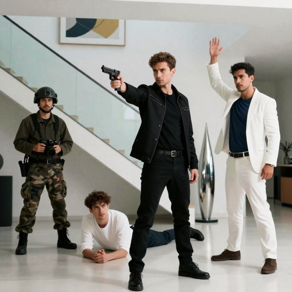 Three men in a modern room, intense expressions. Central man, black, black jacket, black pants, pointing gun forward. Right man, white, green jacket, blue shirt, right hand up. Left man, camo pants, helmet, holding camera. White shirted man on floor. Glass staircase, abstract art, metallic sculptures in background.