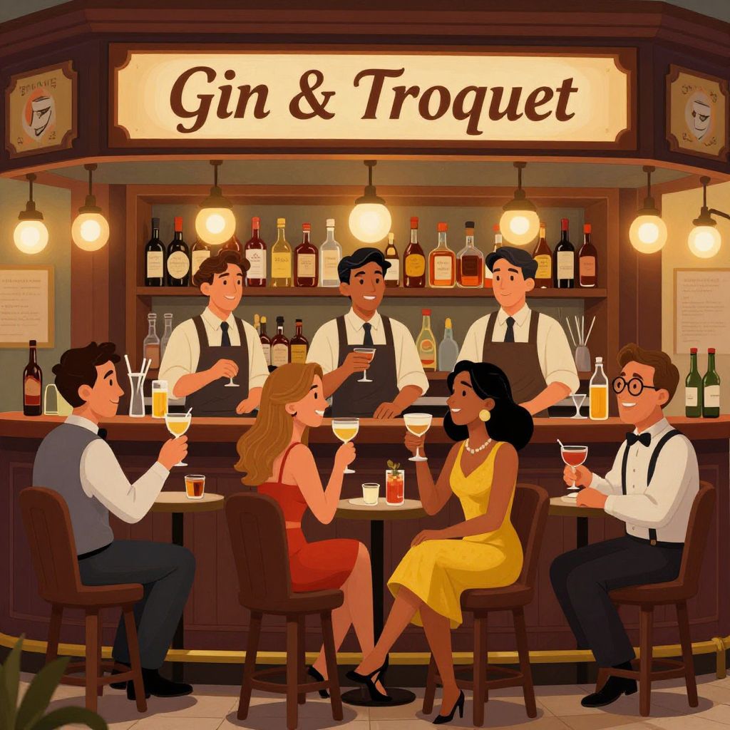A vibrant cartoon-style illustration depicts a lively scene at \"Gin & Troquet,\" a charming neighborhood French bar, featuring elegantly dressed patrons and bartenders engaging in conversation and enjoying drinks, set against a backdrop of neatly arranged liquor bottles and warm, inviting lighting.