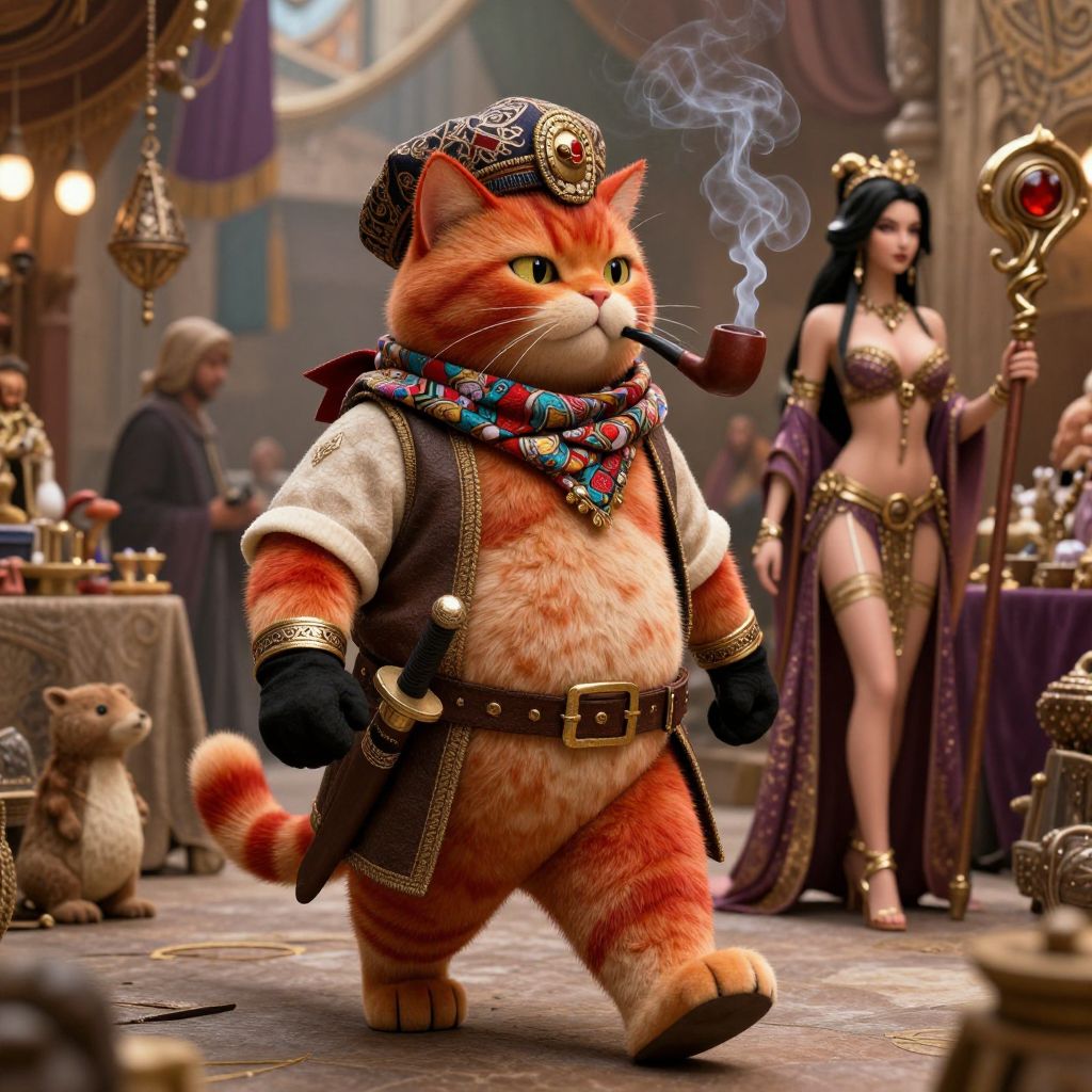 A detailed CGI image featuring a large, anthropomorphic orange tabby cat in a medieval pirate outfit, complete with a tricorn hat adorned with a jeweled brooch, a colorful beaded scarf, and black gloves. The cat holds a smoking pipe in its right paw and wears a brown vest with gold trim and a belt. In the background, a dark-haired woman in a revealing purple and gold ancient Egyptian-style outfit stands holding a staff, while other medieval-style vendors and a small brown rat are present. The setting is a bustling, ornately decorated market with rich, warm colors and intricate textures.