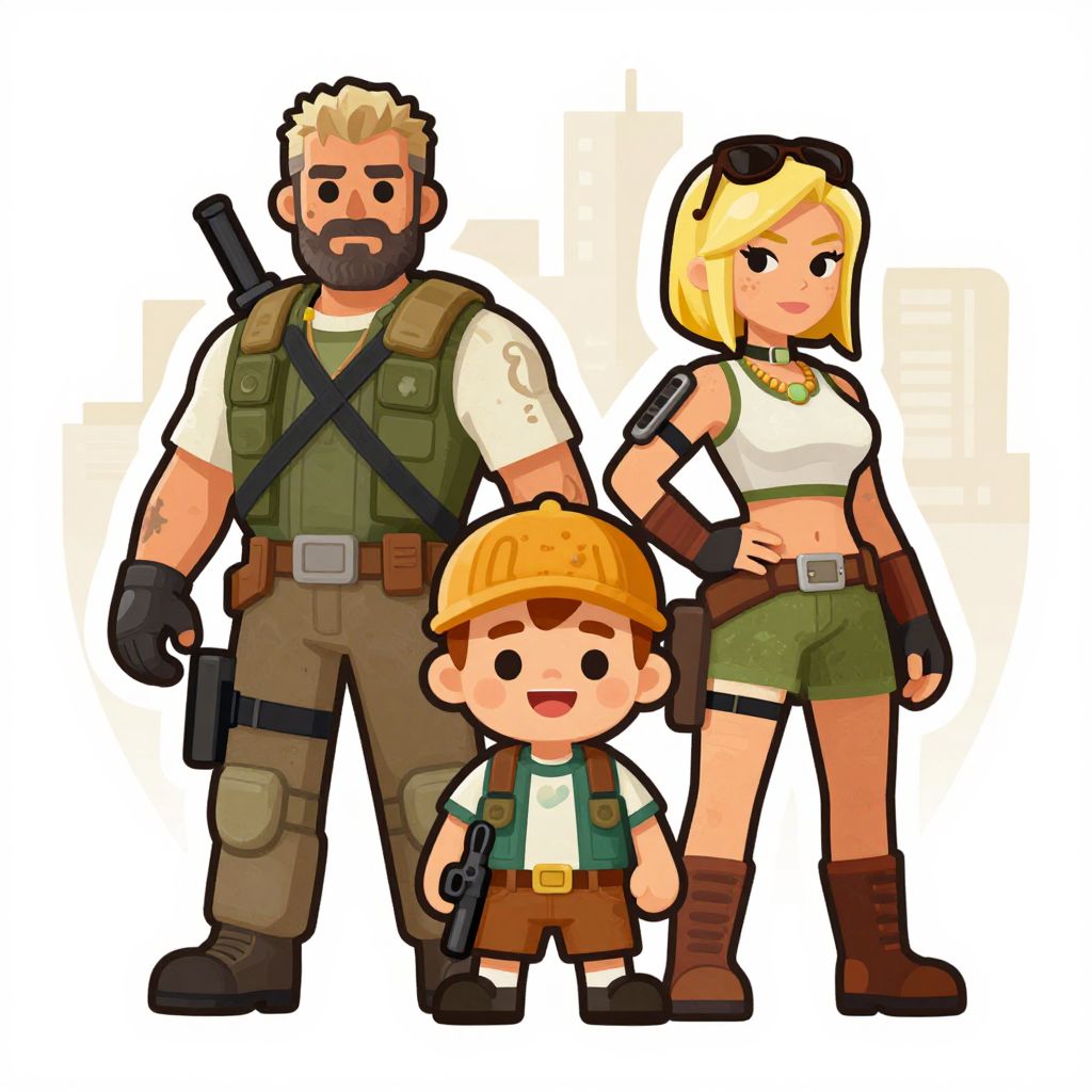 Digital cartoon of a muscular bearded man, a blonde woman in green outfit, and a small child with a yellow helmet, standing together.