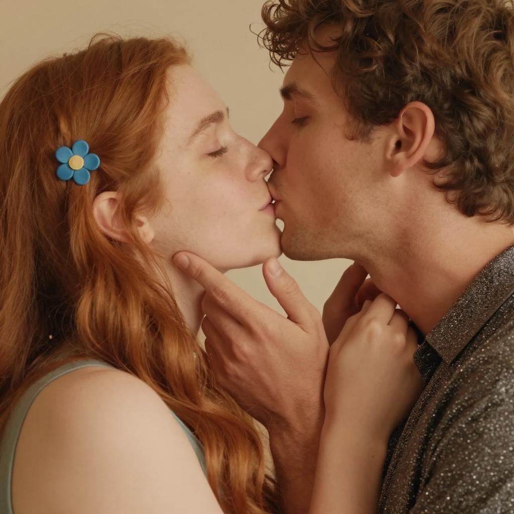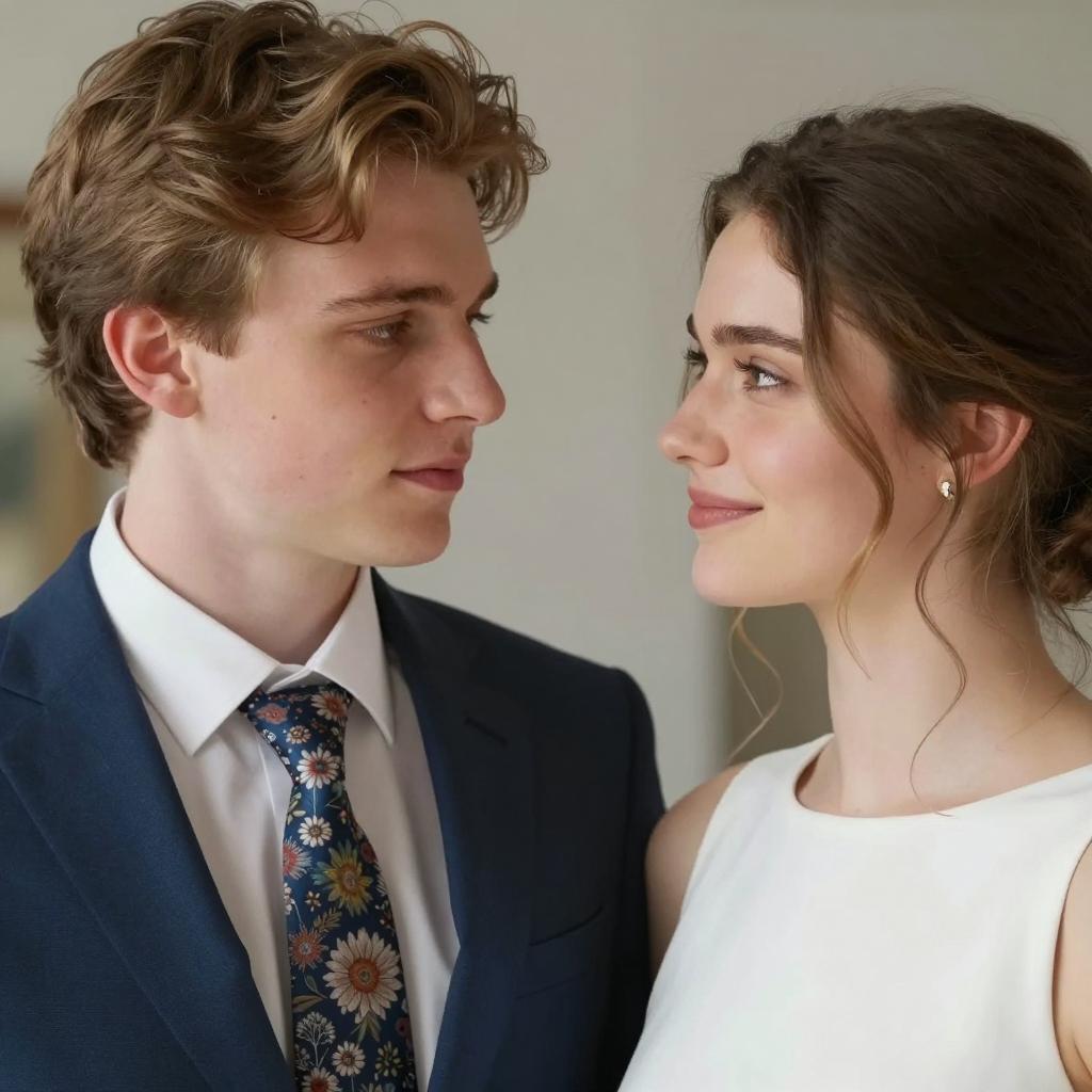 Photograph of two teenagers at a white door. Girl with long red hair, white lace strapless top, looking down. Boy with brown hair, glasses, black suit, blue shirt, looking at her. Door has gold knob, small decorative wreath.