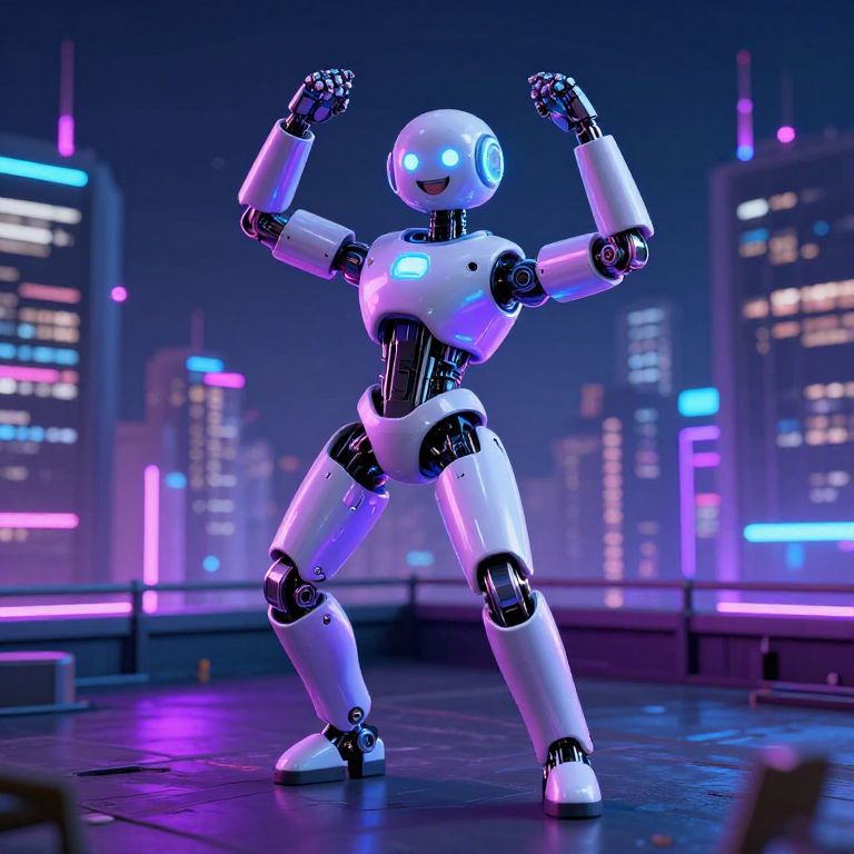 A futuristic robot doing a happy wiggle dance on a neon-lit city rooftop at night, glowing purple and blue lights reflecting off metal, energetic pose with limbs in motion blur, cyberpunk atmosphere, digital 3D art style