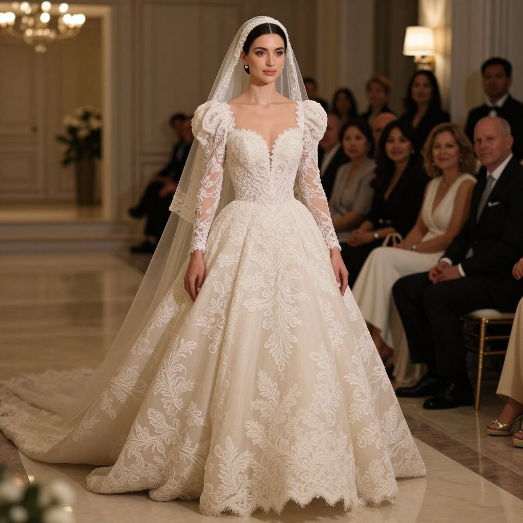 Photograph of a dimly lit fashion show featuring five brides in white, off-the-shoulder wedding gowns with intricate lace and beadwork, and long, sheer veils. The brides are walking a runway with bright stage lights illuminating them from above, creating dramatic shadows. The audience is seated in the background, partially visible in the dark. The bride in the foreground is in sharp focus, showcasing the detailed textures of her gown. The overall atmosphere is elegant and romantic, with a spotlight effect highlighting the brides against the darkened room.