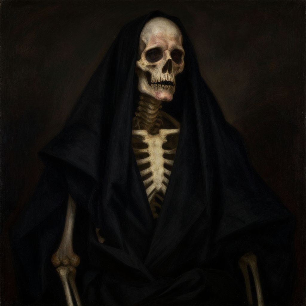 Digital artwork of a skeletal figure with a hooded black robe, exposing a glowing white ribcage against a dark, ominous background.