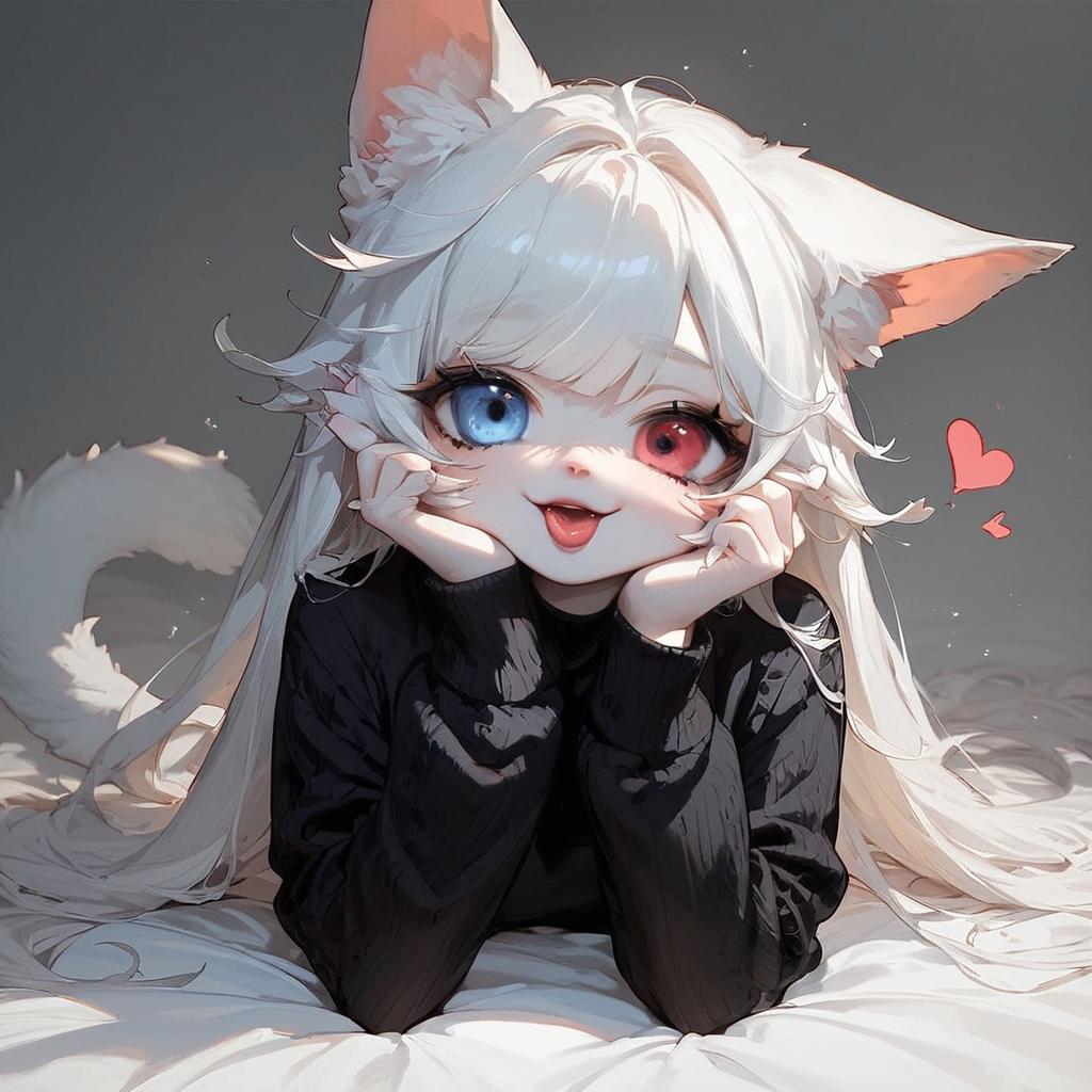 Score_9, score_8_up, score_7_up, Odd-eyed cat girl, open_mouth, Black Sweater, colored sclera, white hair, long hair, heterochromia, black sclera, Furry, on stomach looking at you, blowing kiss, heart, cute, flower, Cool colors, deep scene, detailed background, photo
