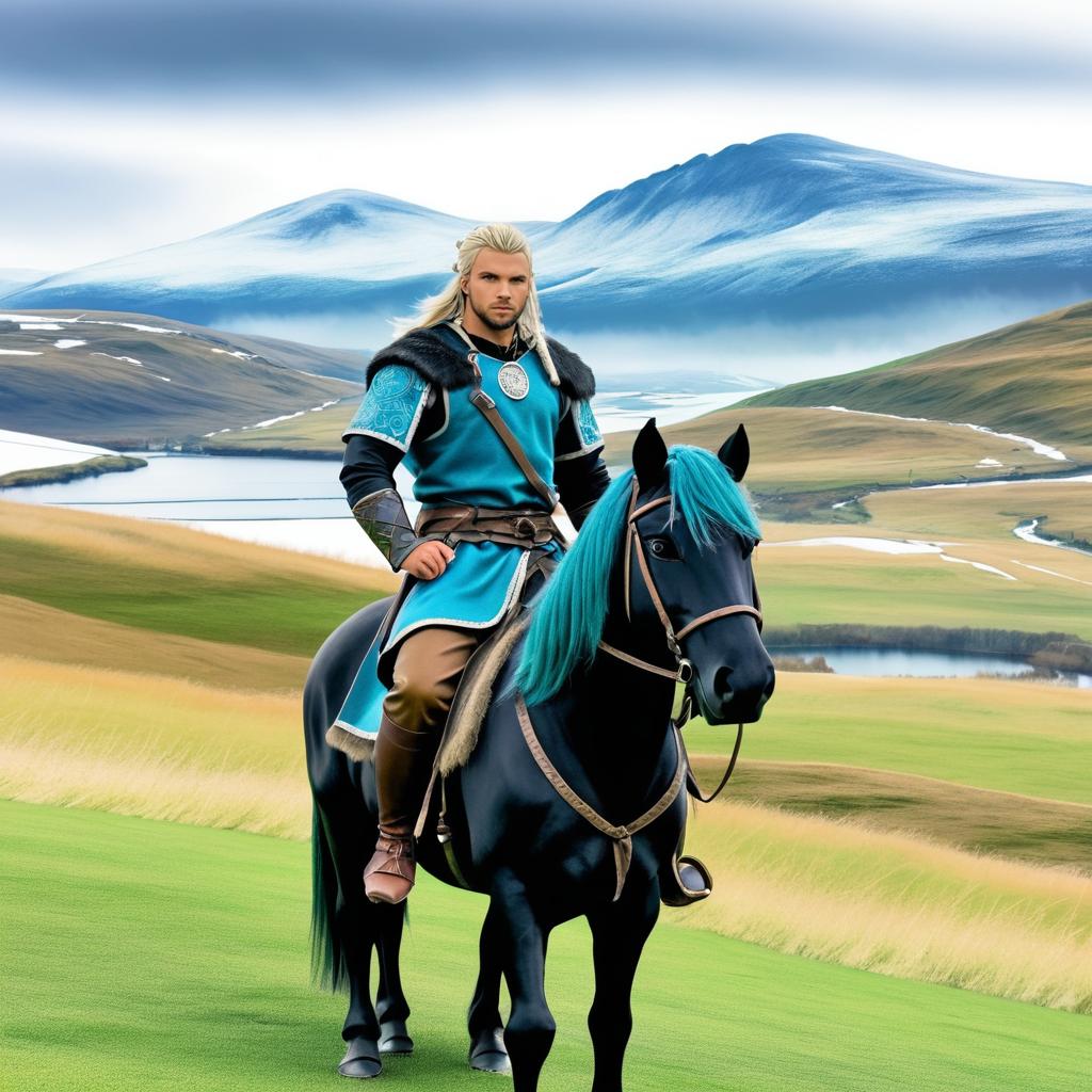 Backdrop mapa style, vinland saga, 28mm lens, wide angle, taken from medium distance, platnium hair, aqua eyes, broad, young adult, masculine nordic tanned skin, viking man on black horse, landscape, beautiful colours, HDR, anime, rolling grass hills, snow capped mountains in distance,