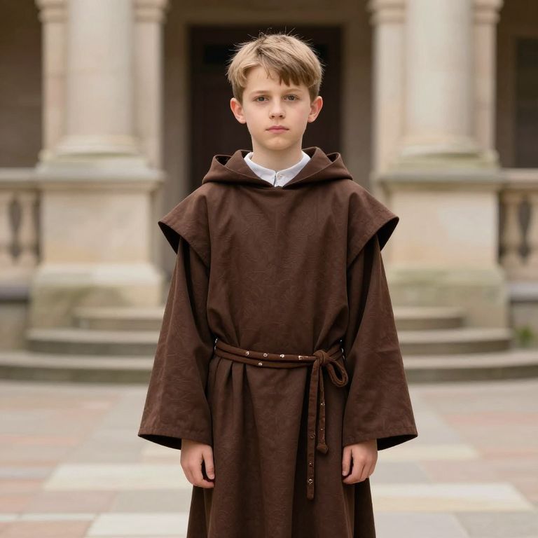 Photograph of a young Caucasian boy with fair skin and brown hair, standing in front of a classical stone building with columns. He wears a dark brown, medieval-style robe with a wide collar and a belt tied at the waist, over a white shirt. His expression is neutral, and he stands with his arms relaxed at his sides. The background includes a blurred stone staircase and a dark doorway. The image has a slightly surreal, digitally enhanced feel, with soft lighting and a slightly over-exposed background.