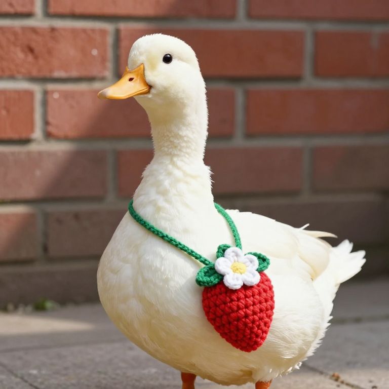 A white duck standing upright under natural sunlight, its head slightly tilted to the side with a curious expression, The duck is wearing a handmade strawberry-shaped crochet bag with a white flower and green leaves as decoration, The background features a red brick wall with soft shadows, and the scene is illuminated by light coming from the upper left, The texture of the duck's smooth feathers contrasts with the rough crochet pattern of the bag, The composition highlights the duck's whimsical and humorous appearance, blending realism with subtle fantastical elements in a bright and cheerful atmosphere