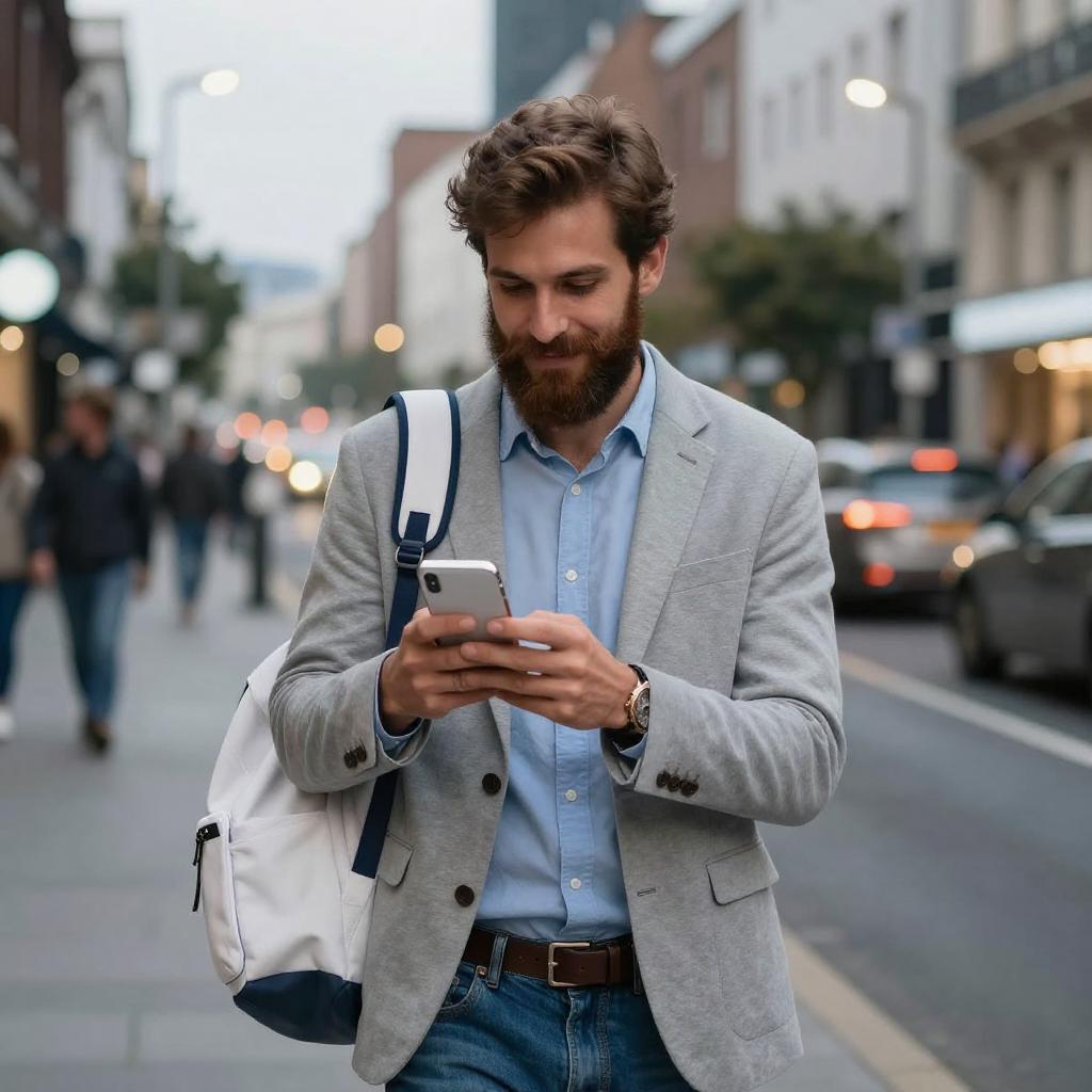 Photograph of a bearded man with short brown hair, wearing a light gray blazer, blue shirt, and jeans, standing on a city street at dusk. He's holding a white smartphone, looking at it with a slight smile, and has a white backpack with blue straps slung over his shoulder. Background shows blurred city lights and traffic, with buildings and streetlights visible.