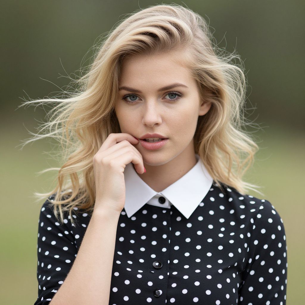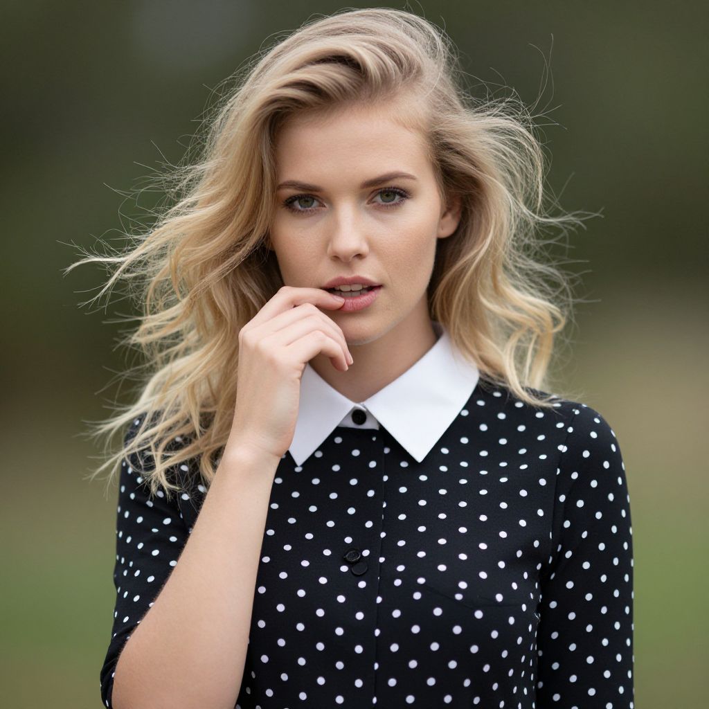 Photograph of a blonde woman with wavy hair, wearing a black polka dot dress with a white collar, posing outdoors, touching her chin softly