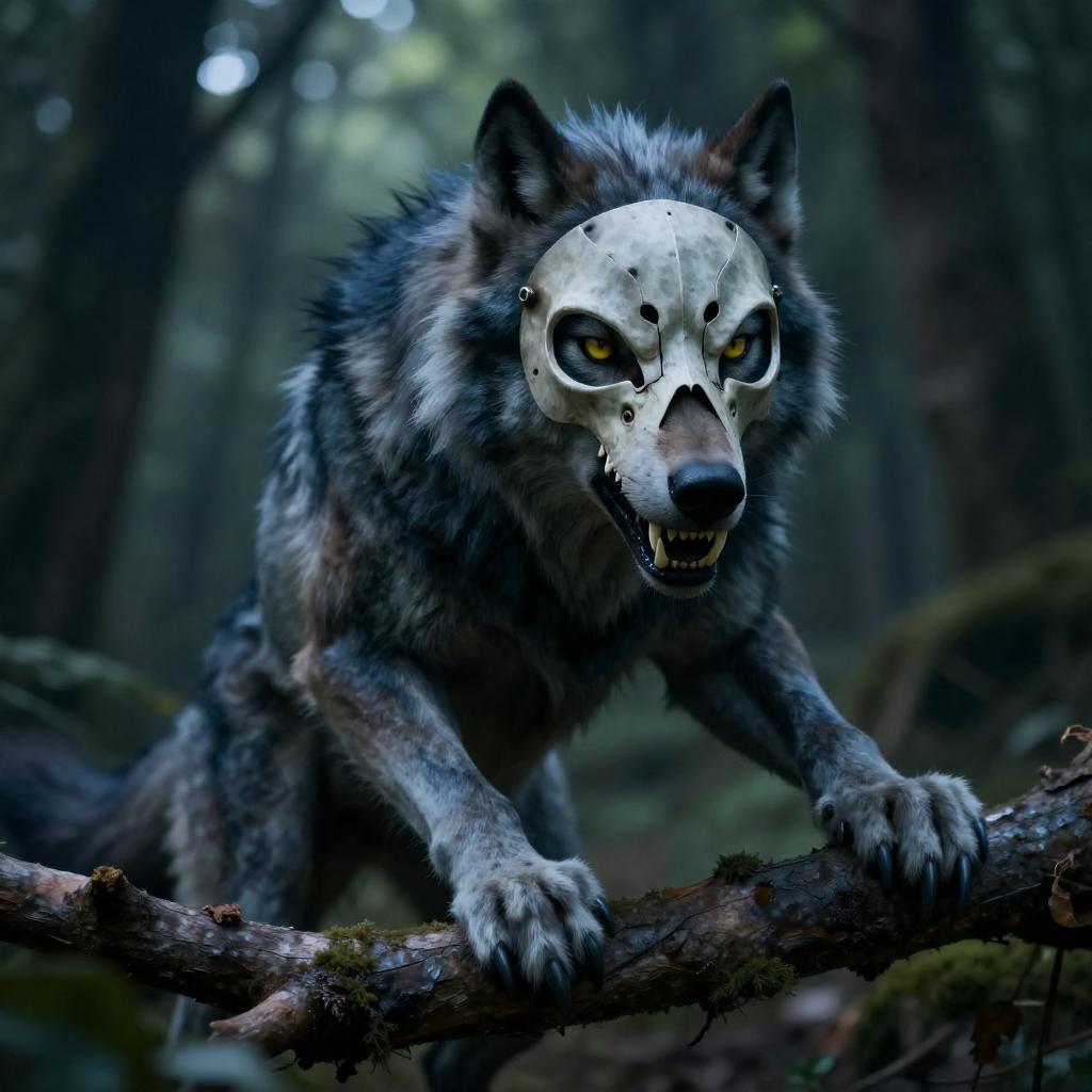 CGI image of a blue-gray, anthropomorphic wolf-like creature with sharp teeth, dark fur, and a skeletal mask, gripping a tree branch with a clawed hand. The background is a dark forest with blurred green foliage. The creature's intense yellow eyes are focused forward. The image has a moody, eerie atmosphere.