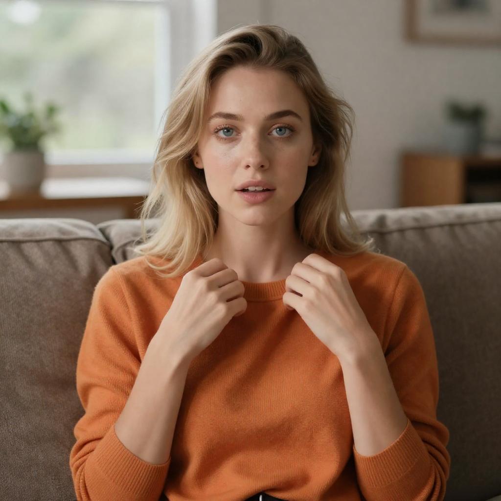 Photograph of a woman with light blonde hair, wearing an orange sweater, sitting on a brown couch. She has light blue eyes, slightly parted lips, and is looking directly at the camera. Her hands are raised to her chest. Background shows a blurred room with soft light and a window with greenery outside. A patterned blanket is draped over the couch.