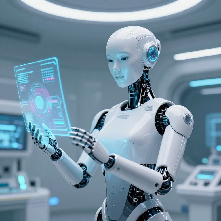 A sleek, white humanoid android with blue accents, positioned in a futuristic medical bay. The android has gentle, articulated hands reaching out towards a floating holographic interface with blue and pink graphical elements. Soft white and blue lighting illuminates the advanced medical environment, emphasizing a calm and hopeful atmosphere.