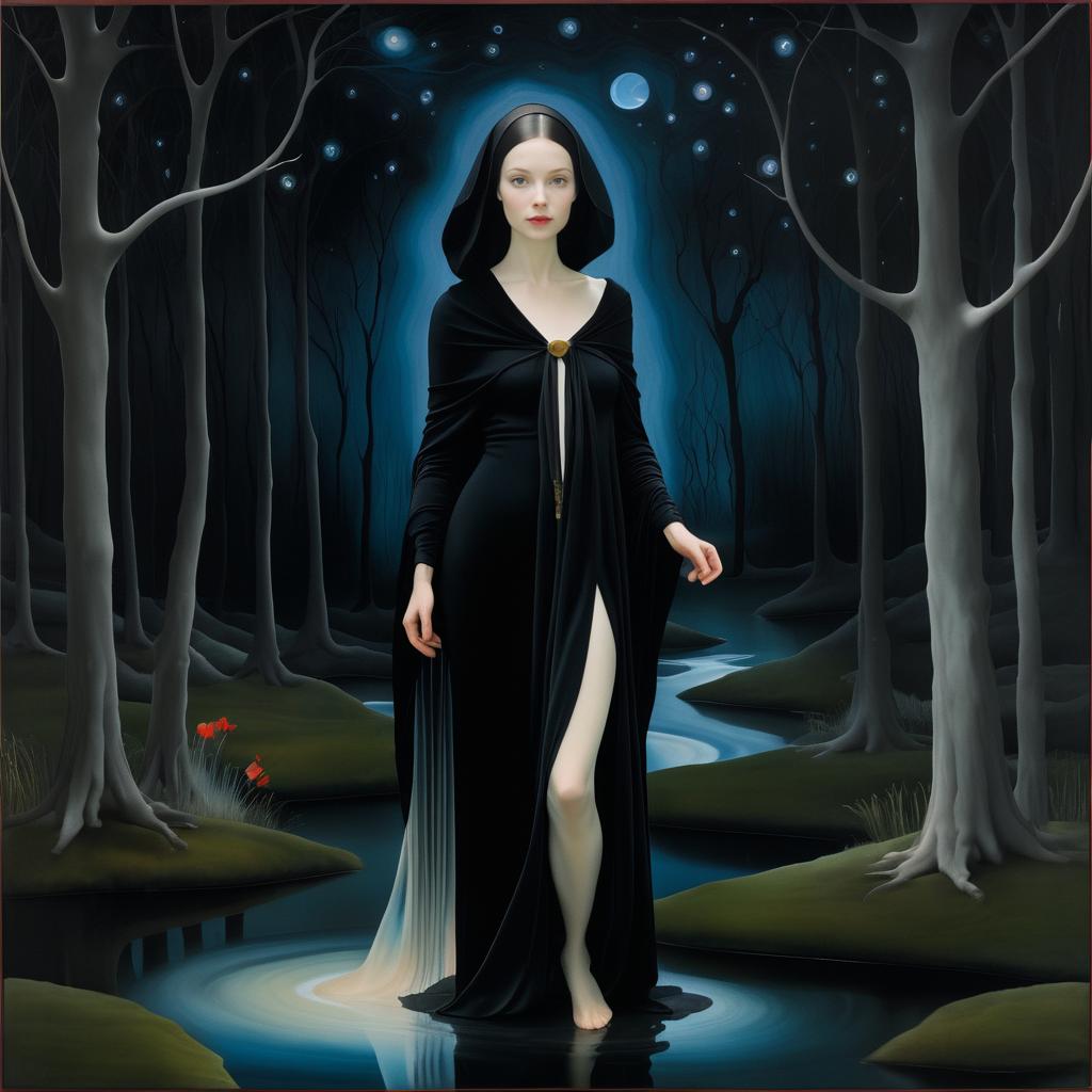 Painting of a woman with skin like flowing water, slim, tall, dressed in black with a scarf around her neck, set in a nighttime forest scene in the style of Hieronymus Bosch.