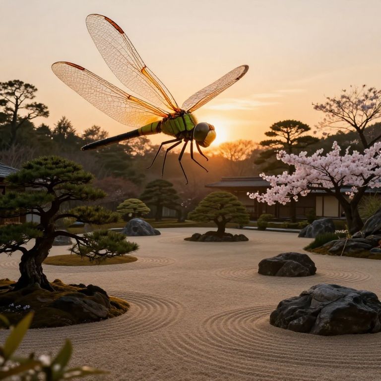A mesmerizing scene unfolds, showcasing a tranquil Japanese zen garden bathed in the warm glow of sunset. Carefully arranged rocks and pruned trees create intricate patterns amidst raked sand, their silhouettes softened by the golden hues of the fading day. From an unconventional vantage point, as if seen through the eyes of a colossal dragonfly, this serene landscape transforms into a realm of wonder. The iridescent wings of the insect shimmer in the soft light, revealing intricate details within the garden—miniature bonsai trees and delicate cherry blossoms—that evoke both peace and solitude. This unique perspective emphasizes the vastness of nature while seamlessly blending traditional Japanese aesthetics with modern digital art techniques, inviting viewers to embark on a journey of introspection and explore the harmonious fusion of ancient beauty and innovative visual storytelling.