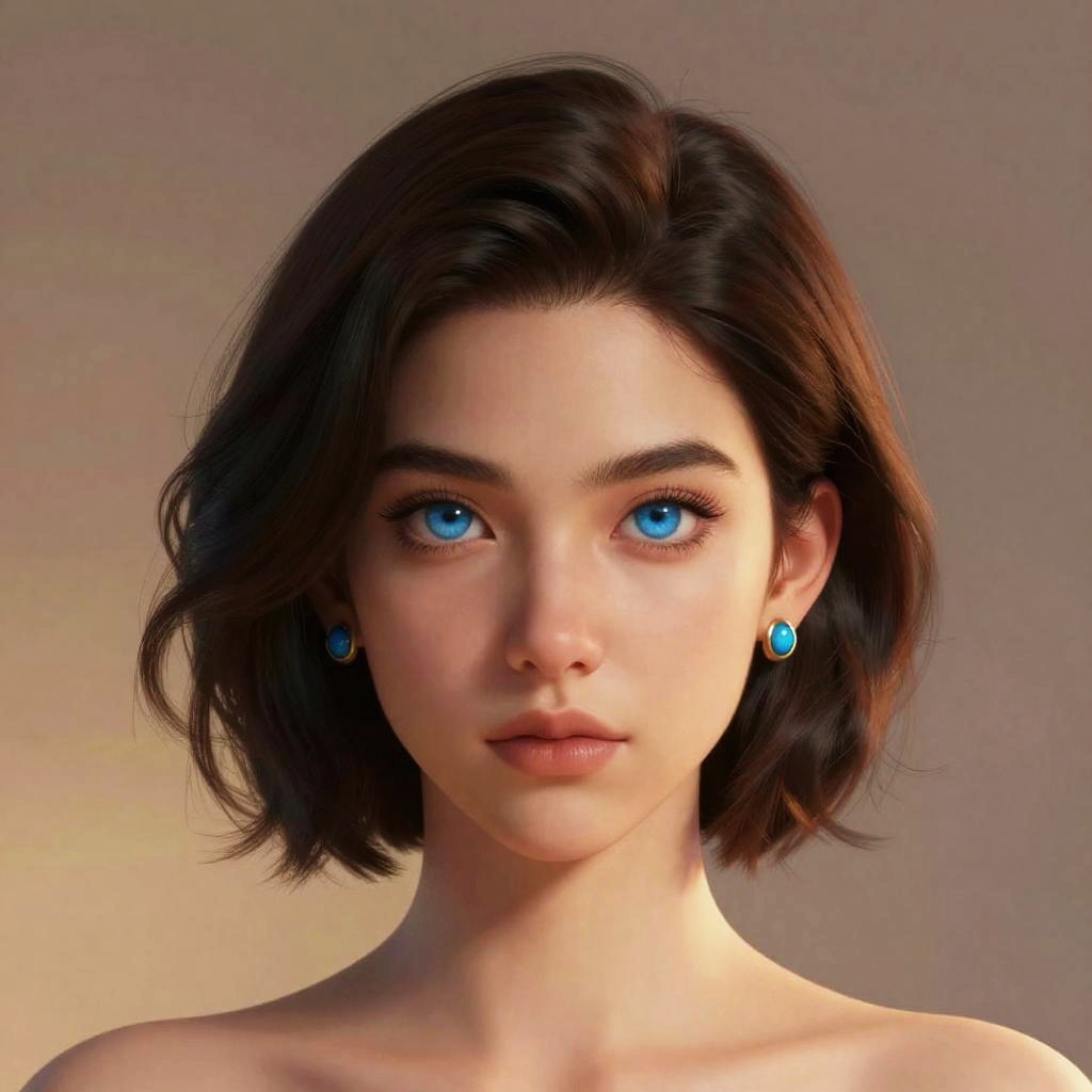 This is a digitally rendered portrait of a young woman with striking blue eyes and short, wavy dark brown hair. She has fair skin and wears small, round blue earrings. Her expression is serious and focused, with a subtle glow surrounding her head that adds a halo-like effect. The background is a textured, warm gradient, emphasizing her features. The art style is realistic with a slight fantasy touch.