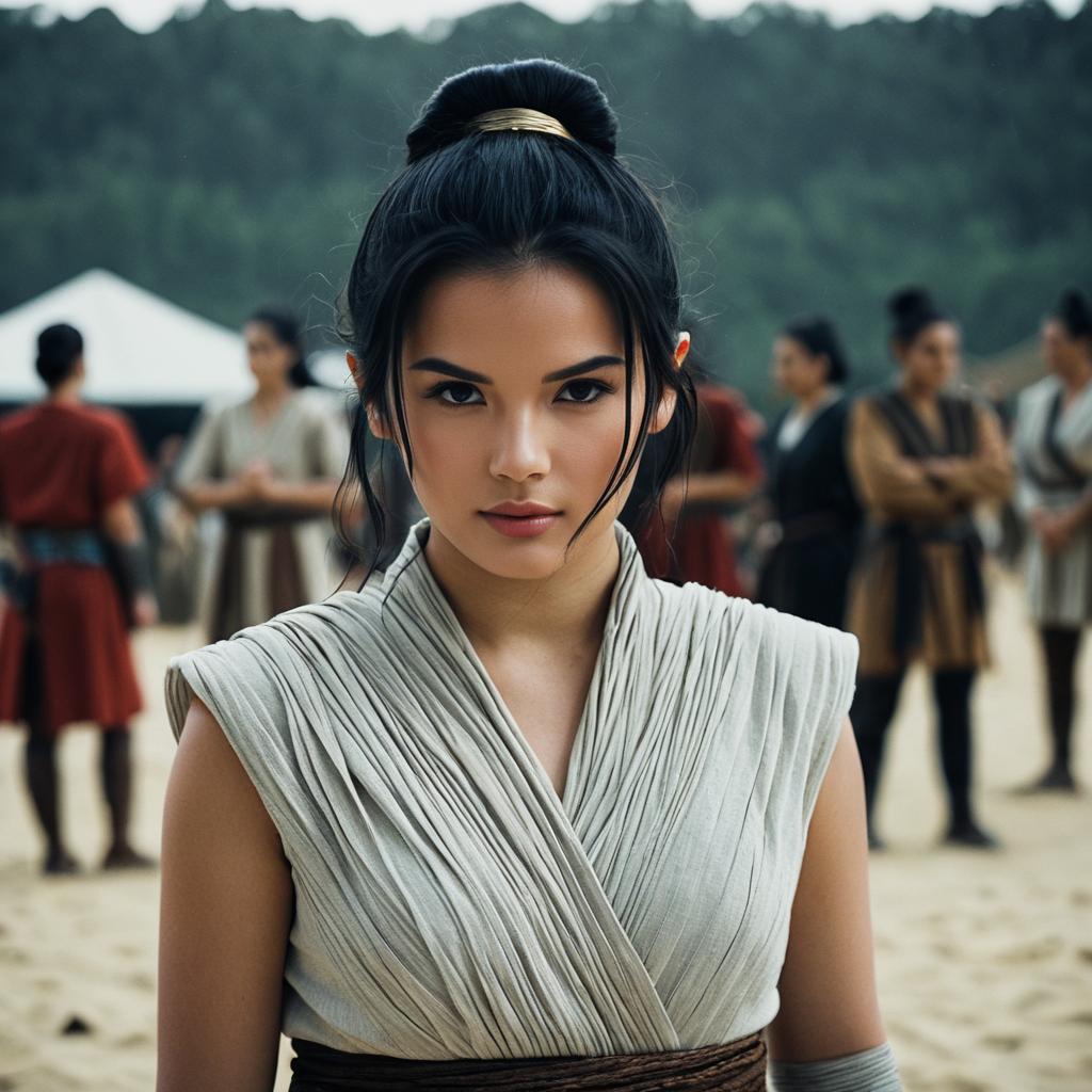 A portrait of a young woman with short black hair and a serious expression wearing a white cape with a black belt, standing outdoors with blurred figures and trees in the background.